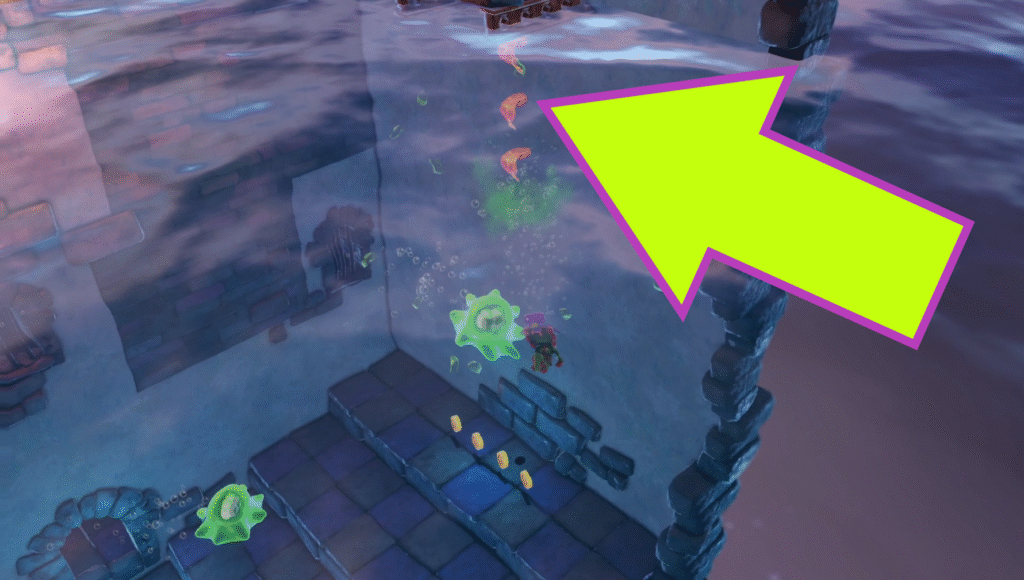 Continue forward and jump into the pool of water. Underneath the short ramp are three more Quills to grab.