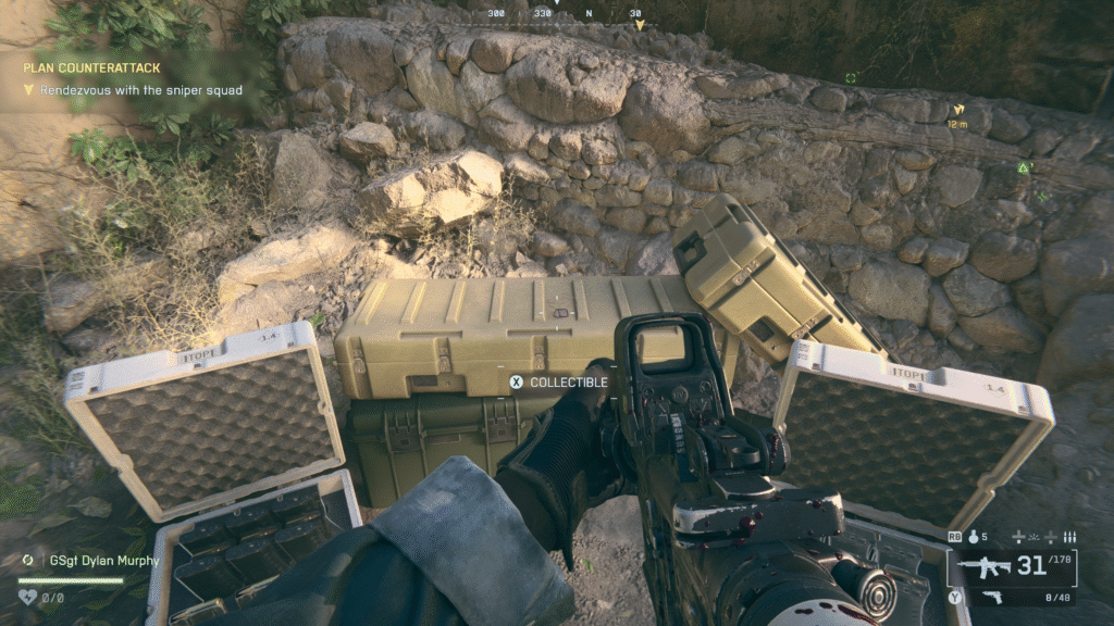 As you approach another raised bit, you’ll spot some ammo crates to your left. The collectible is between the two ammo crates on another crate in the middle.