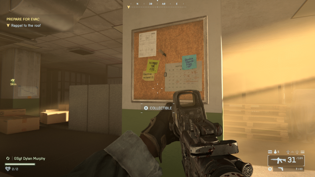 You’ll progress through the level until you enter a large building. You’ll be instructed to plant C4 to take out the building. The second time you plant C4, move forward in the room you’re in and take your first left, after stepping forwards. Walk towards the windows and on your left, on a noticeboard on a pillar is the collectible.