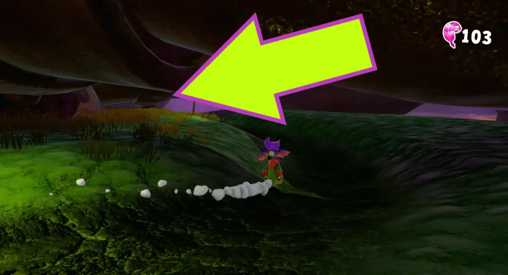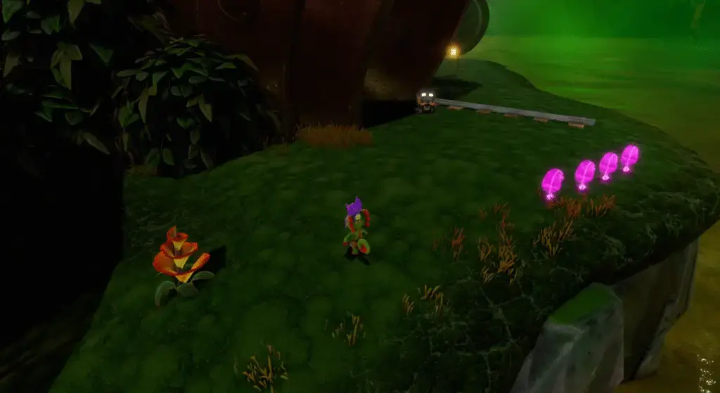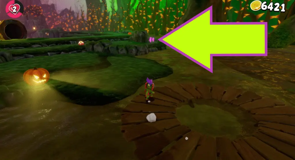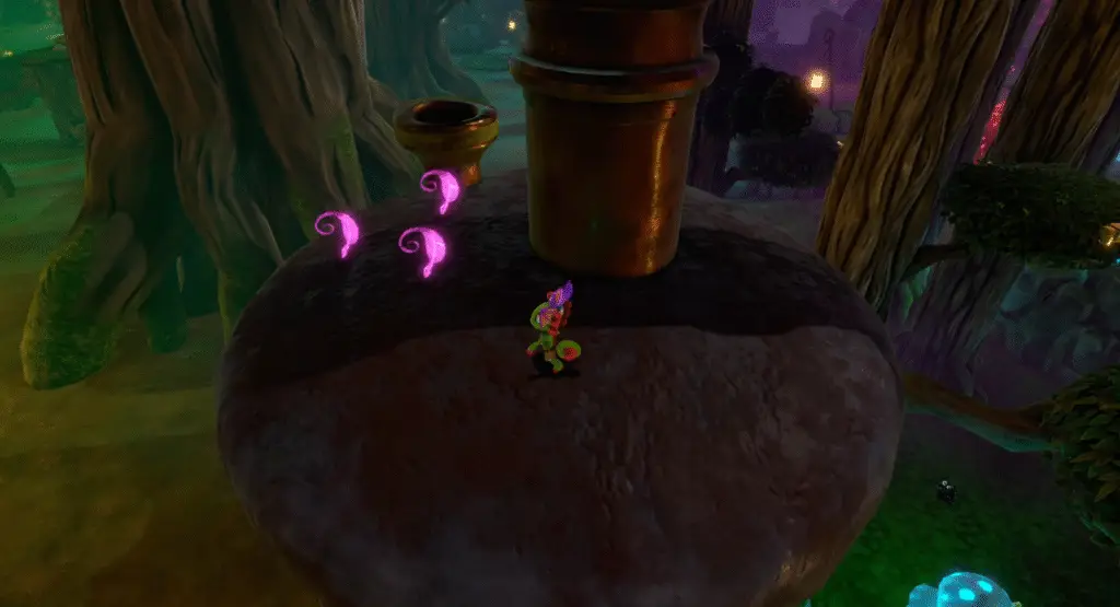 You’ll find another tongue hookshot challenge further on, with a jack-o’-lantern at the start. Reach the end of the course to find three Quills on top of a pipe.