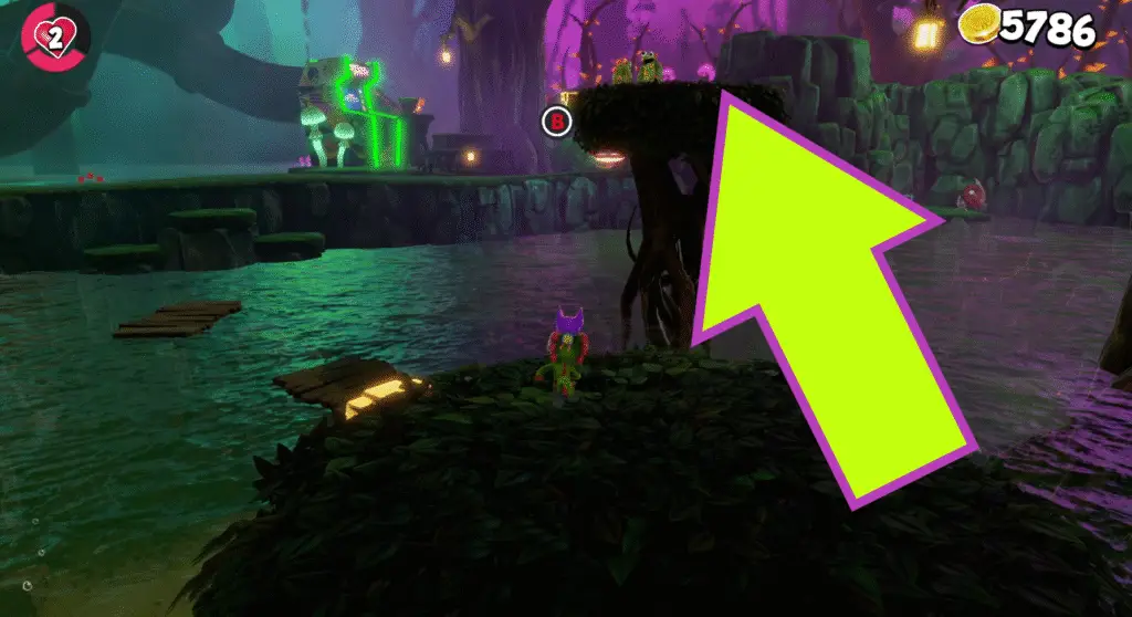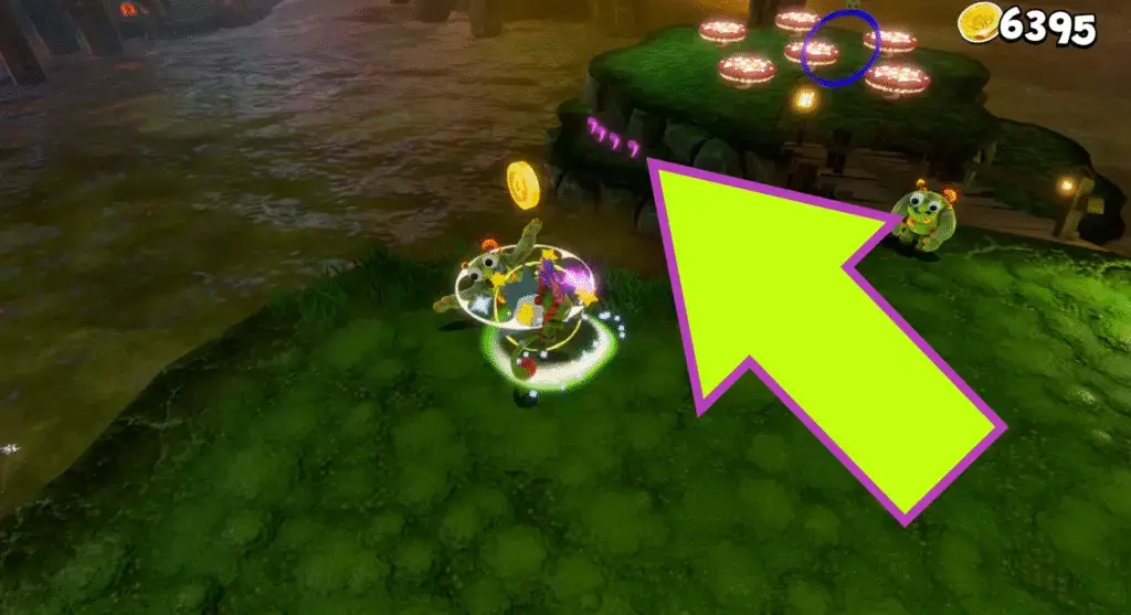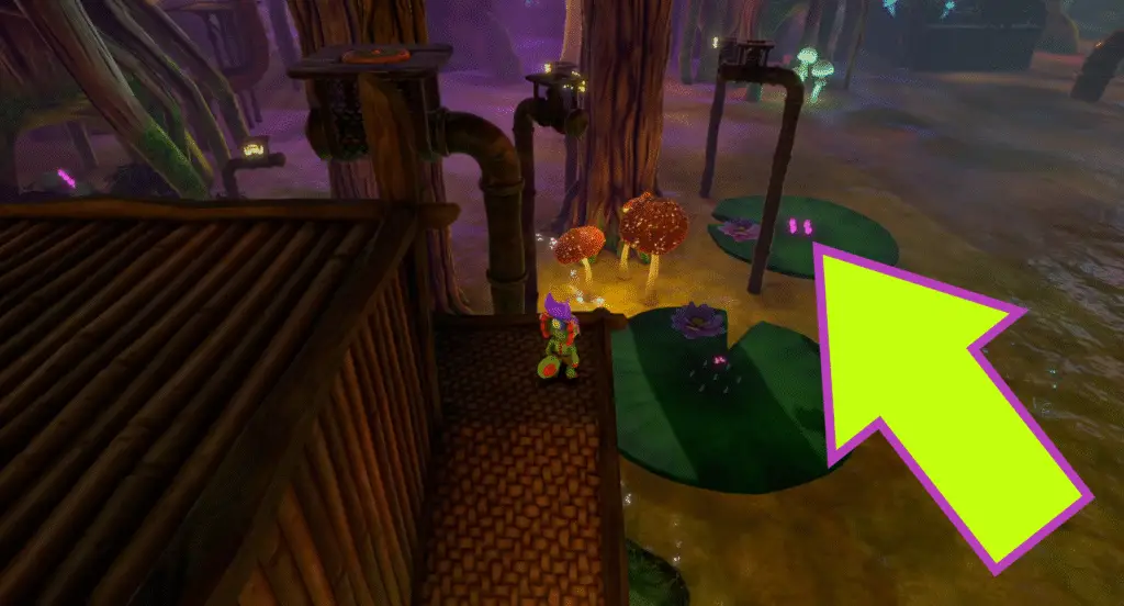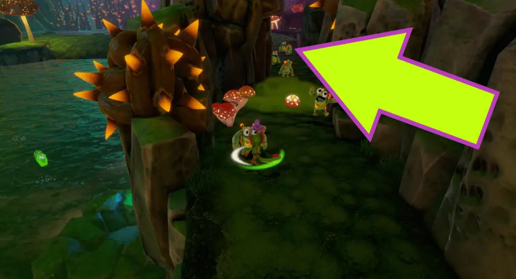 Continue along this route, crossing some murky water using bouncy mushrooms. Before reaching the other side of the water, look to your left to see a quartet of Quills on another bouncy mushroom.