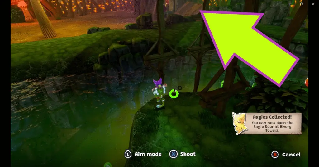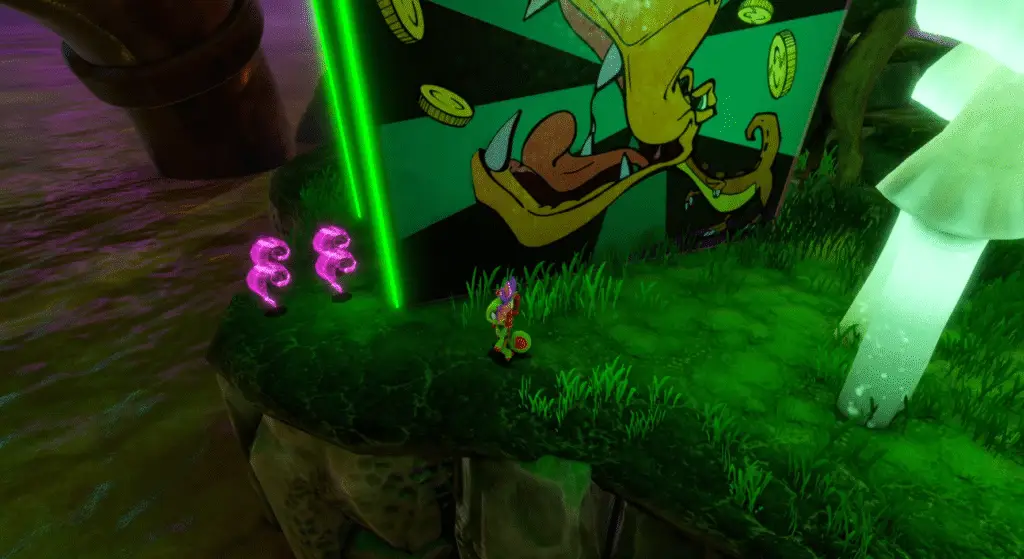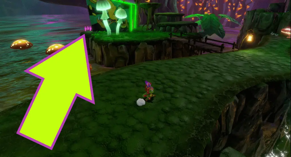 Cross the water and hop out the other side to find Rextro and his arcade machine! Tucked behind the machine are four Quills to nab.