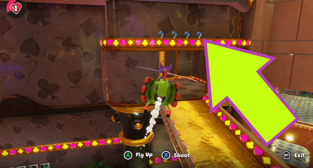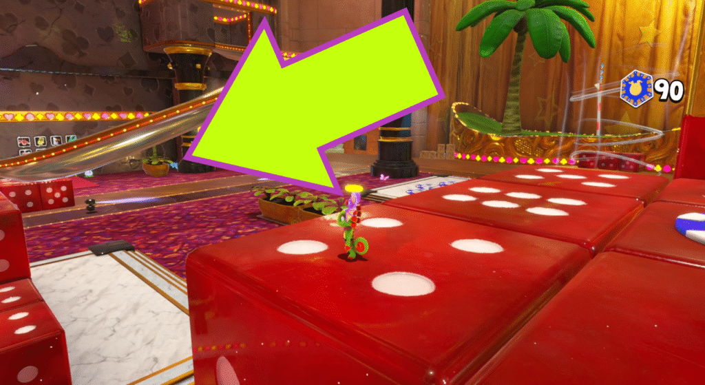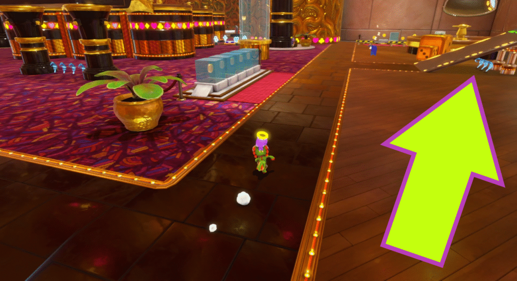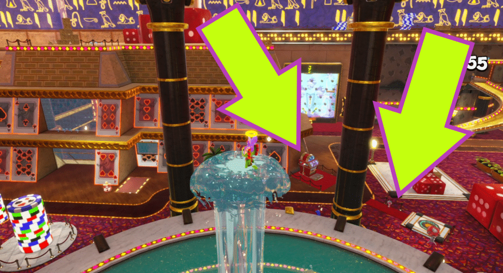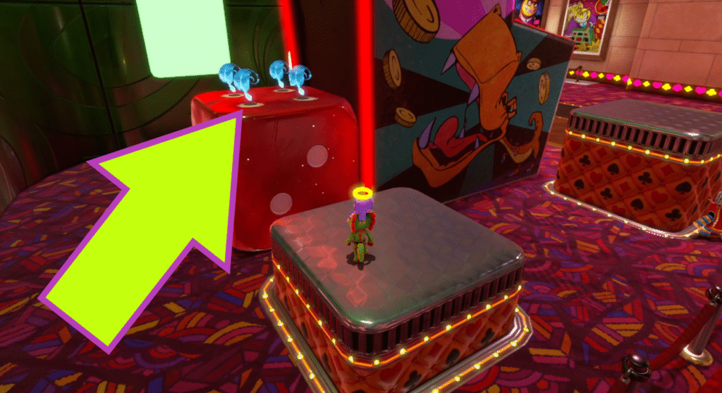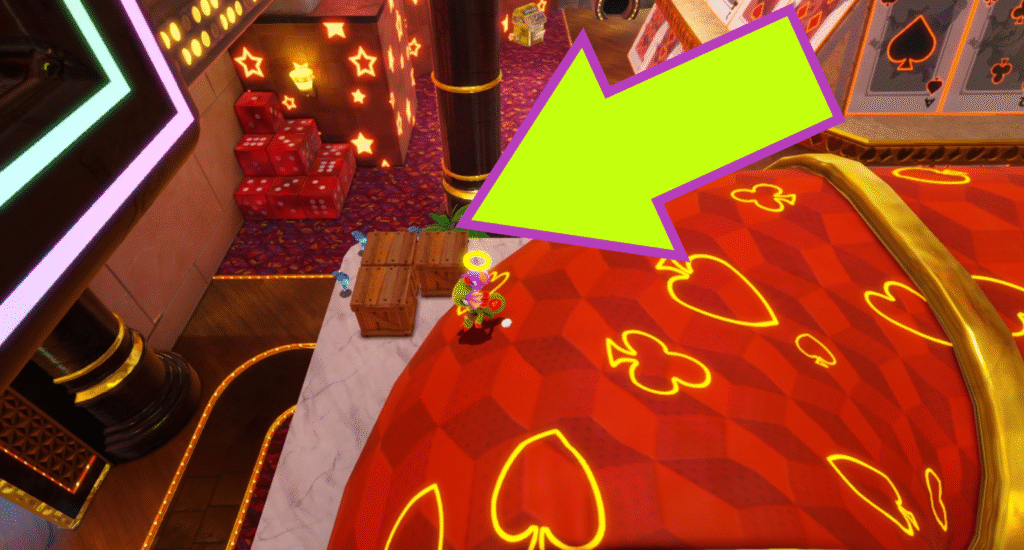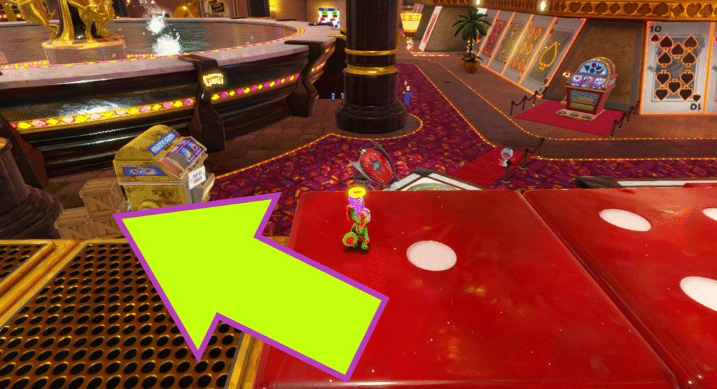Run along the narrow ledge near the slot machine by Kartos, and ride the air vent up. Continue forward, and drop down on the other side to find some large red dice blocking the way. Glide around them and smash through some wooden crates to find these four Quills.