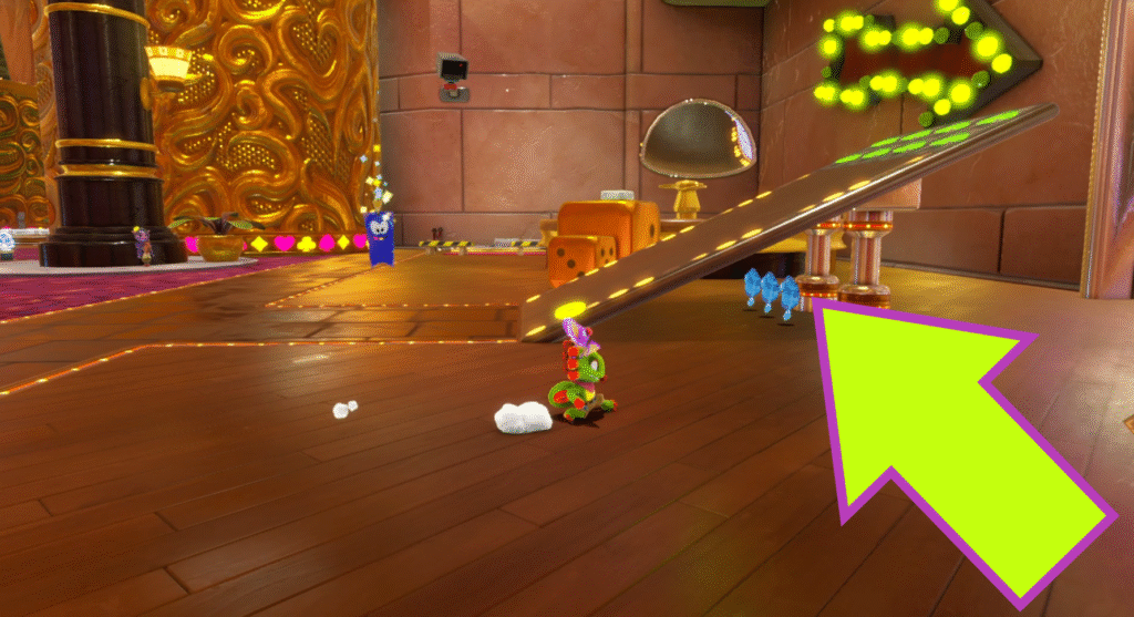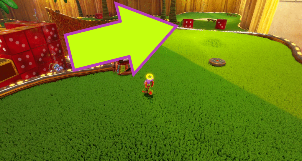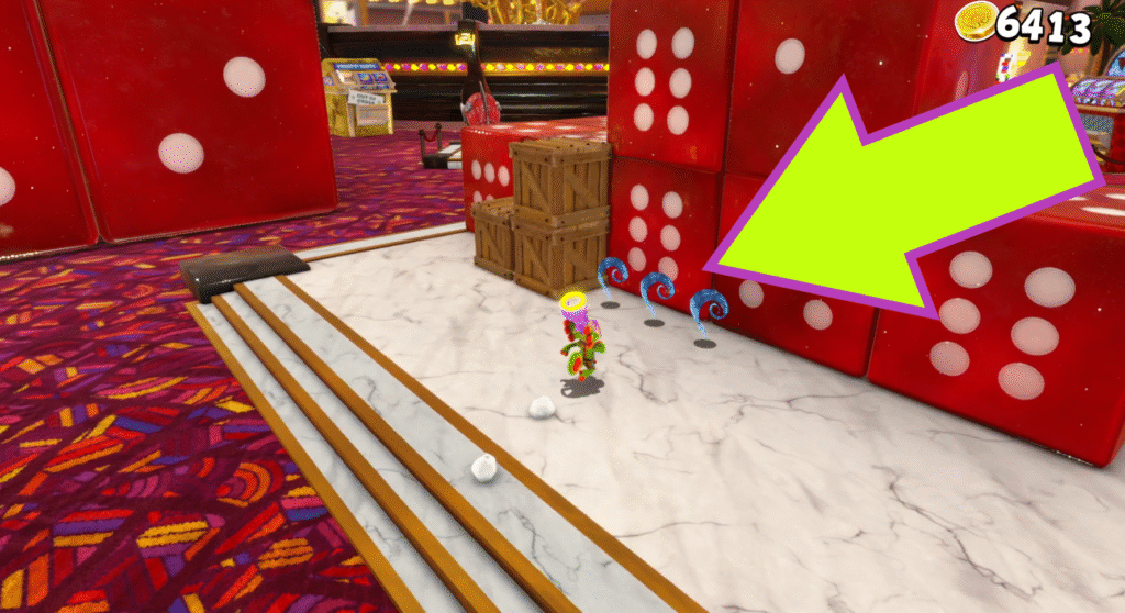 Leave the red dice structure the way you got in, and look over to the corner where the gold course ends to see a stack of wooden crates. Smash them to reveal a trio of Quills.