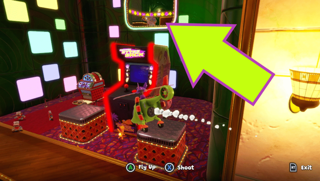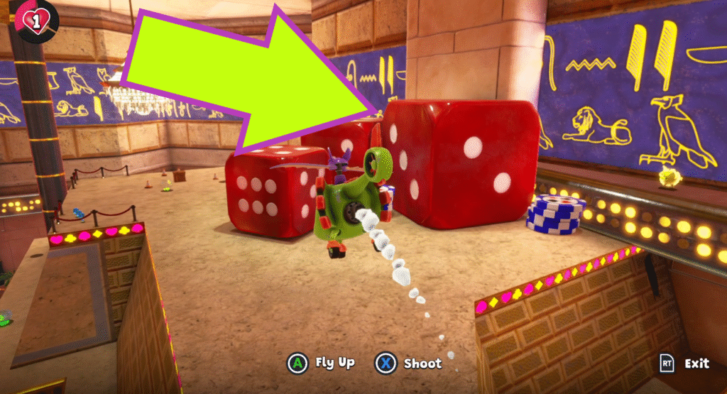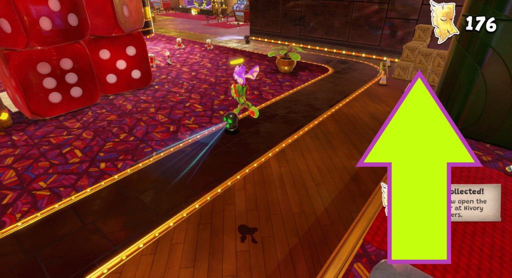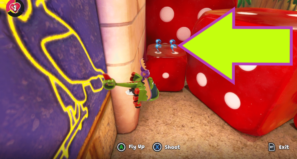 Drop down to ground level and run around to Rextro’s arcade area. Climb up the large red dice nearby, like we did earlier in the guide, and use the tongue hookshot point above you to reach the roof of this building. There are four Quills right in front of you when you get up there.