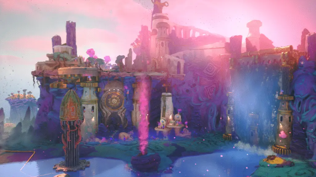 This statue can be found in the area where you get covered in pink candy floss stuff and it makes your lighthouse dude able to jump and glide (with the help of Twig). You’ll know you’re in the right area because there’ll be a short cutscene when you enter, highlighting the waterfall to the right.