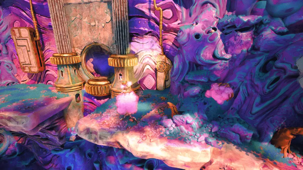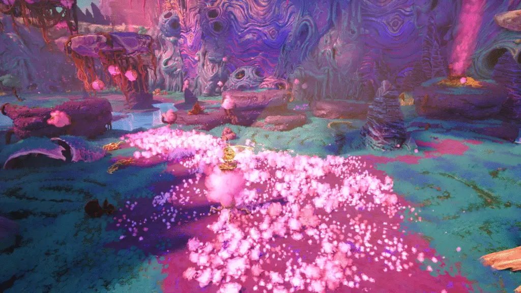 This prompts a creature to emerge and eat the flowers. It’ll then activate a pink air jet stream which you can use to ascend.