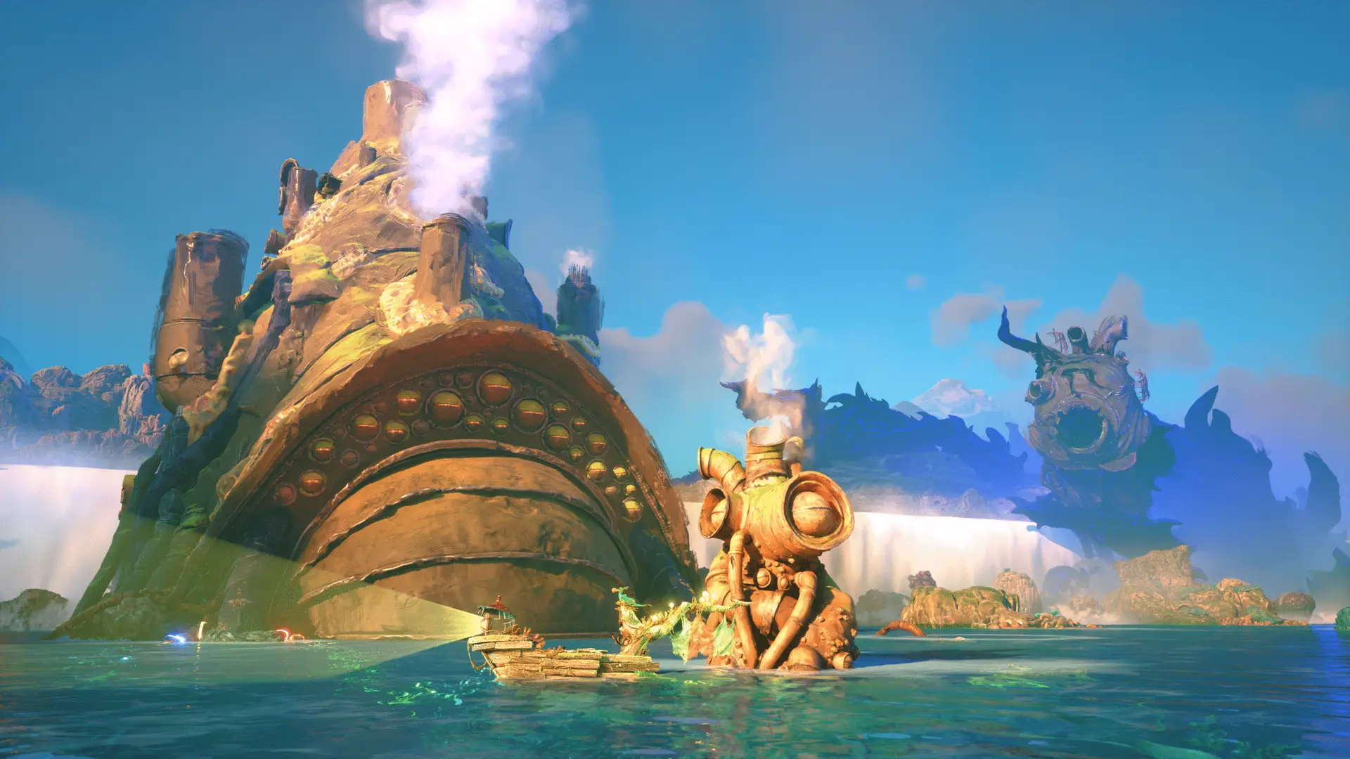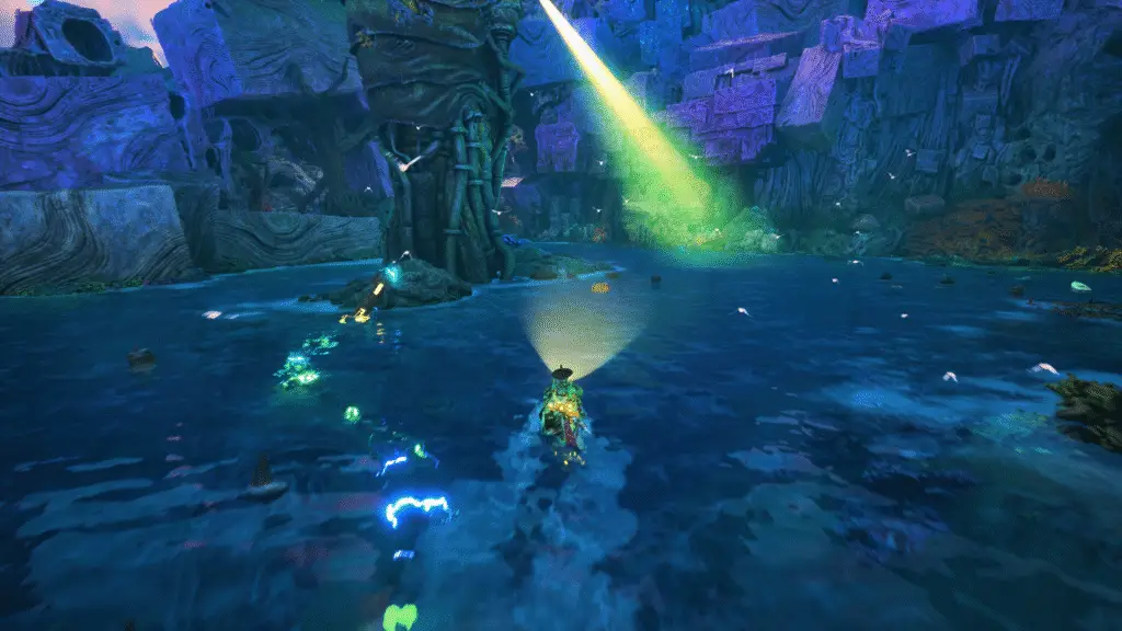 This when you’re the boat. You’ll enter a large area with a structure that looks a bit like a frog. It’ll have a power orb hanging from a power spot in front of it. Get Twig to push it back in (X).