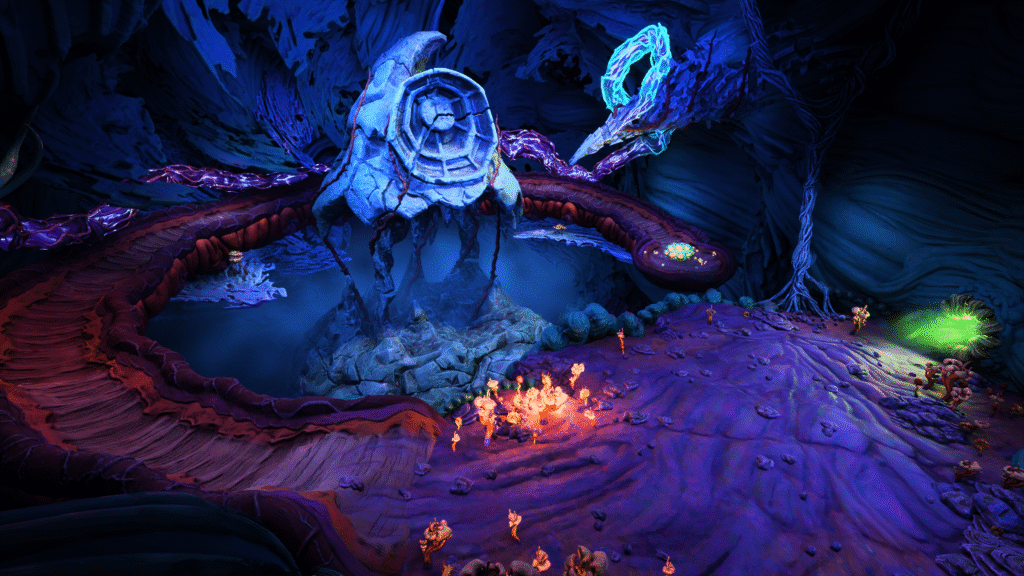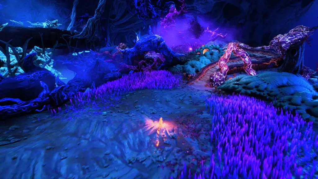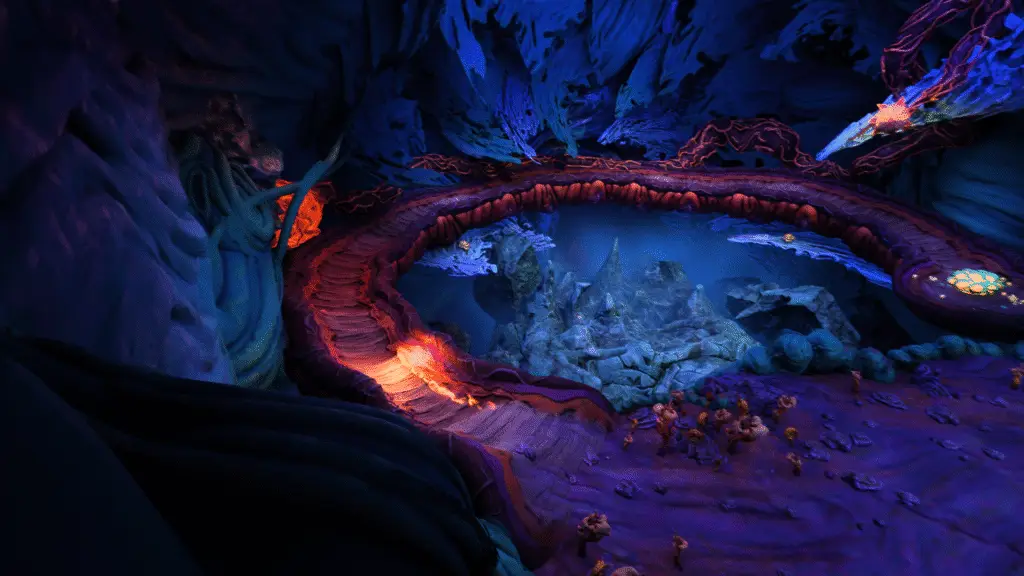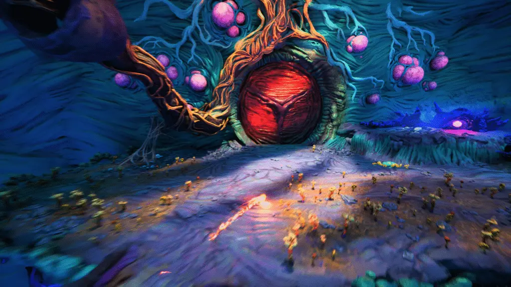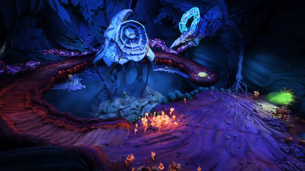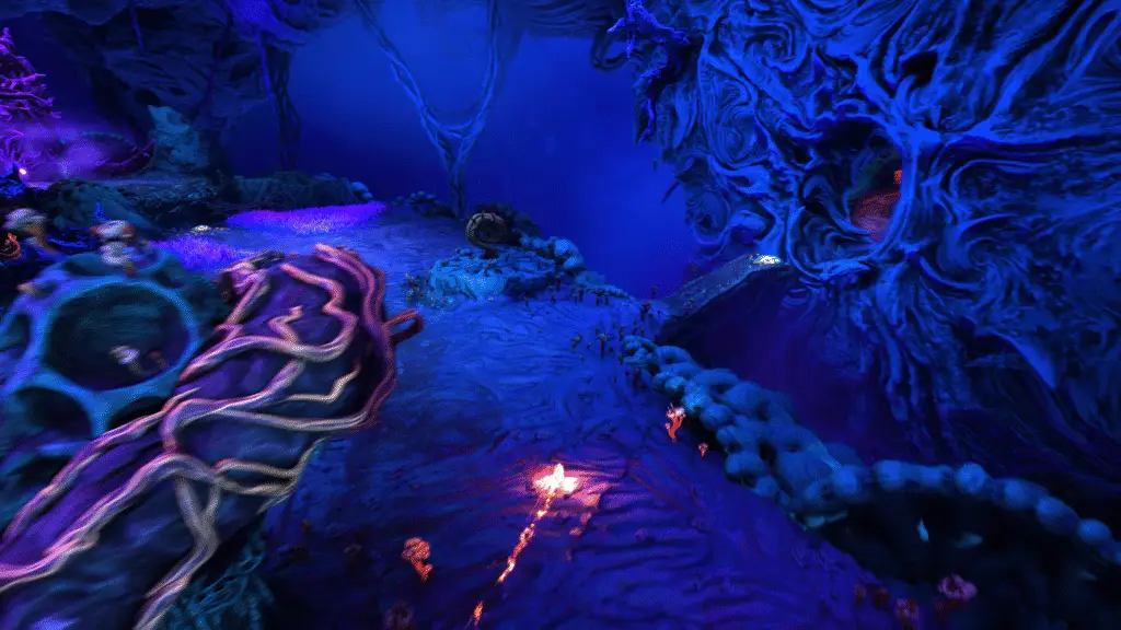 Keep going until you reach this next area. You’ll spot some floating enemy type things, as well as a red energy sac on the right, as well as the path you need to continue down.