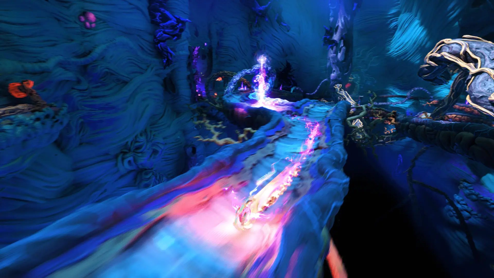This is in the area where you are just the light. You’ll reach a fairly convoluted area of tracks, where you have to unlock a door at the end. To do that, you’ll need to make contact with lots of energy sacs around the room, as well as remove the corruption in the way.