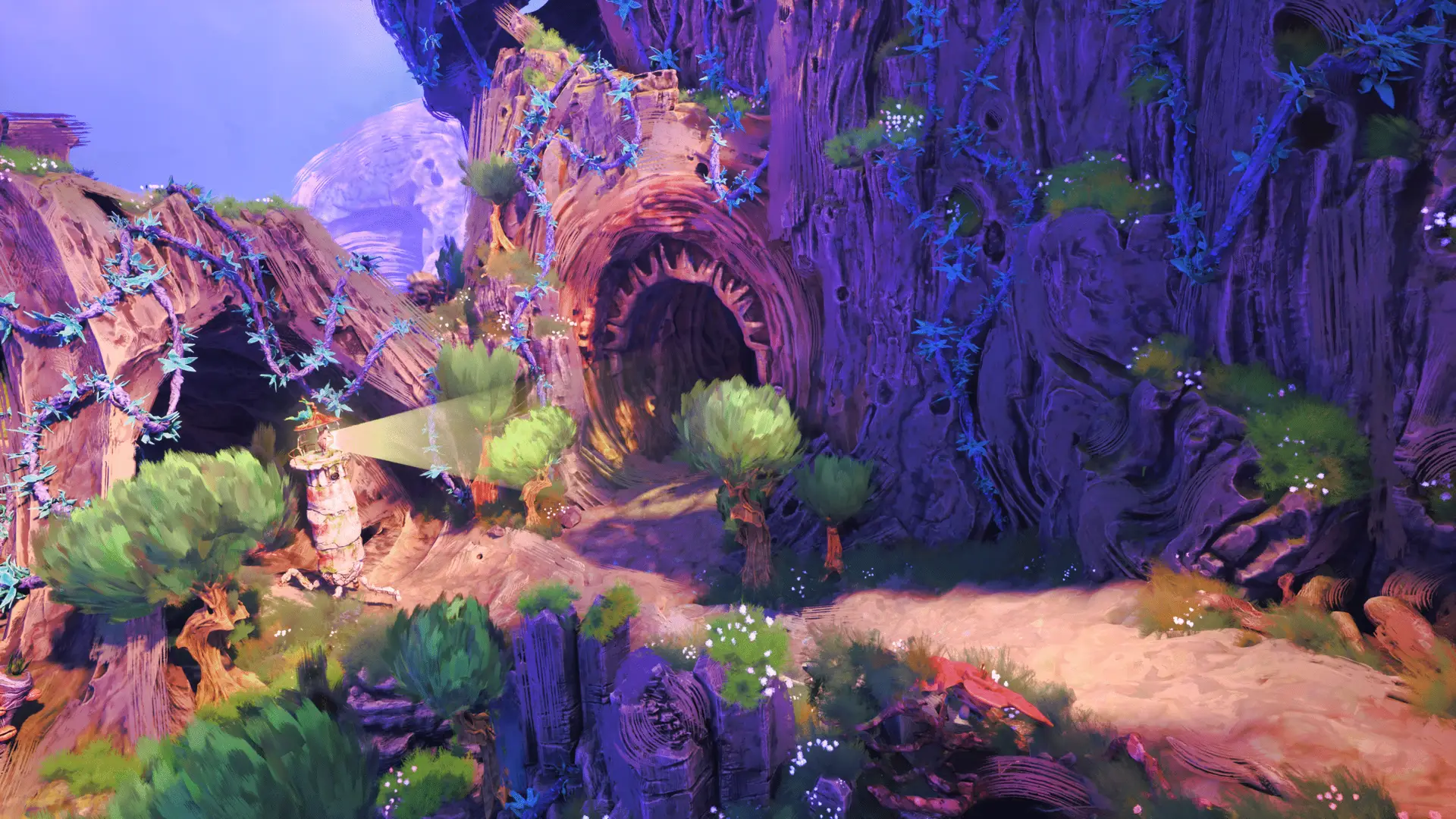 Once you’ve restored the mechanical statue in the middle of the town, you can head up the slope behind it to leave the area. Follow the path around up the hill and eventually you’ll come through a bit of a tunnel on to a cliffside.On the left, pretty easy to spot, you’ll see a circular door that can be opened with your focused lamp (RT).