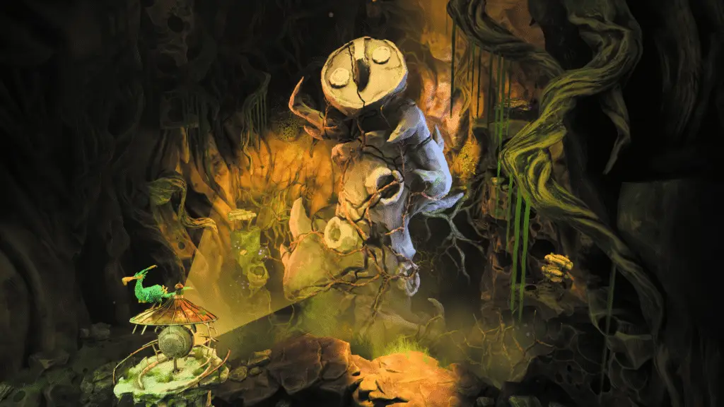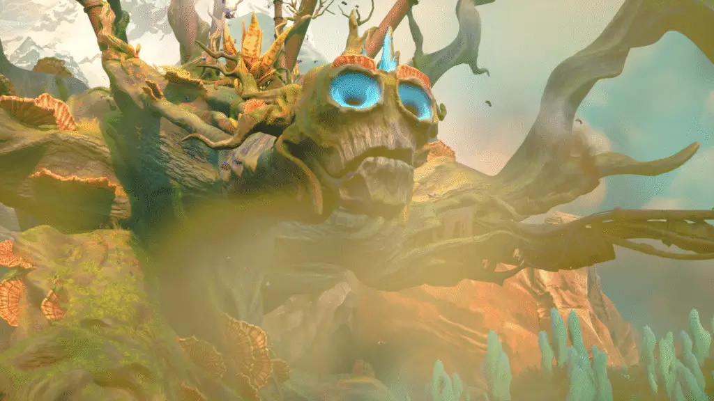 The game doesn’t necessarily have ‘levels’ in the traditional sense. However, you’ll find this statue after the very green area you come to. You’ll need to make your way through the area and solve a couple of puzzles to get some blue fruit looking objects to give to a Tree Guardian type character who has lost his eyes.