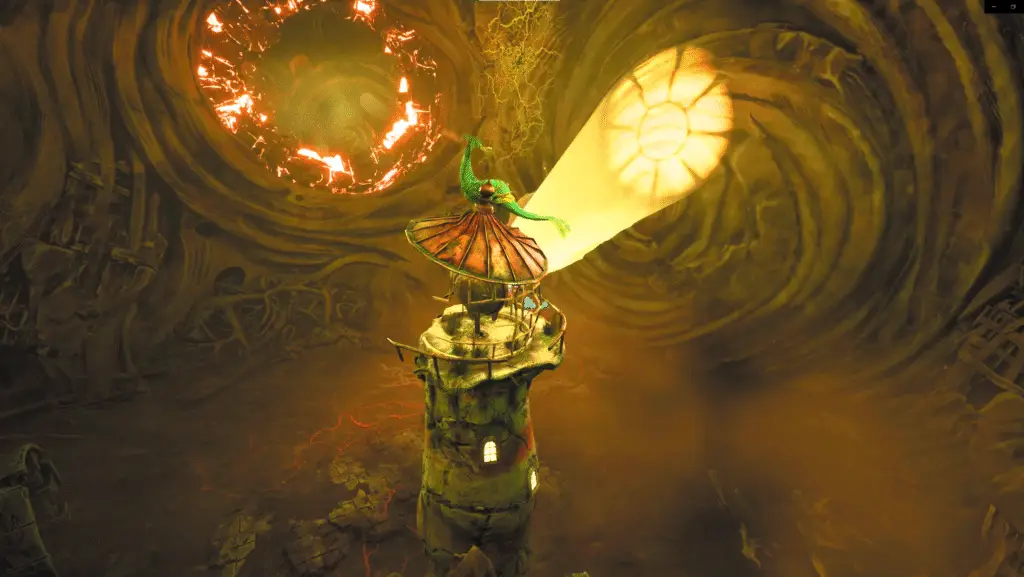 Once you have returned the eyes, it will raise up and allow you to go through, into an underground cave area. This is where you’ll find the statue of Nodus. Once inside, you’ll eventually land in a ciruclar room with lots of circular shapes that can be cleared using your lamp when focused (RT).