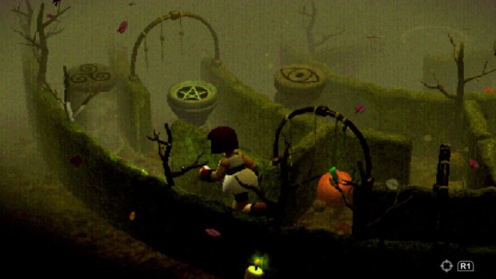 Now take the left path and make it to the end to find another teleporter with a button and a second Pagie.