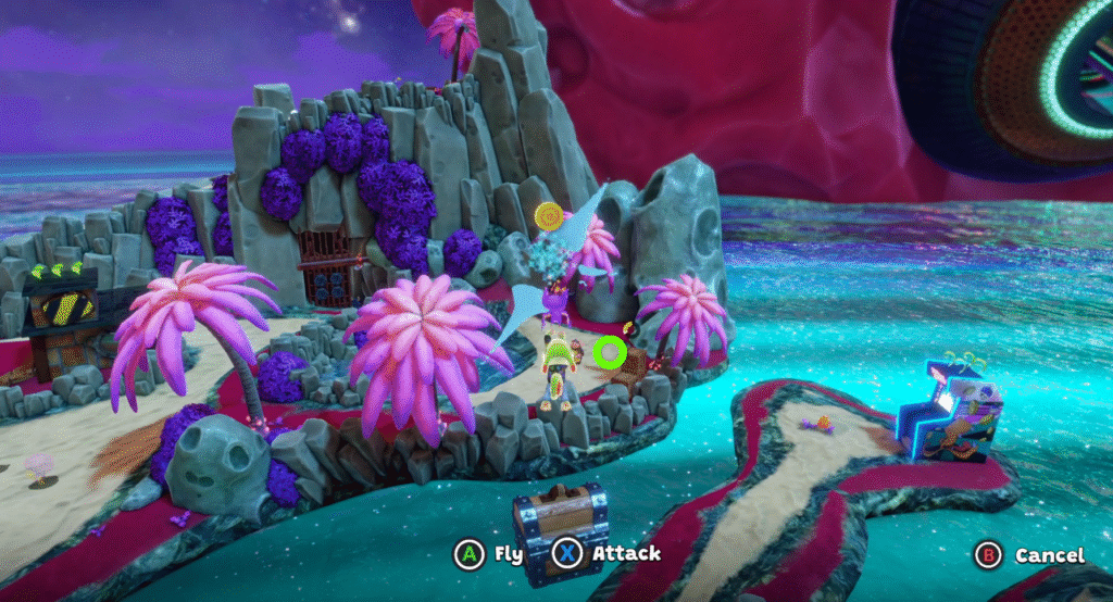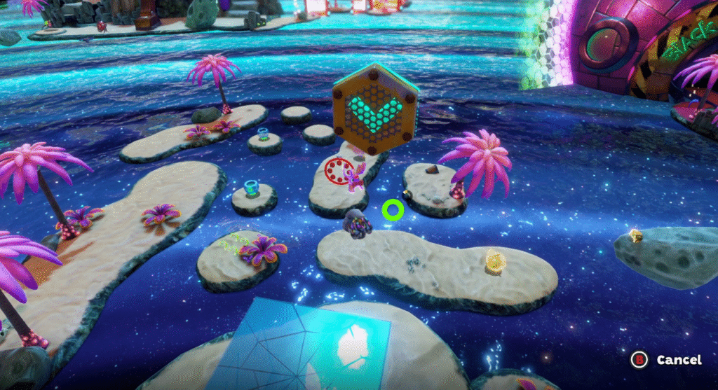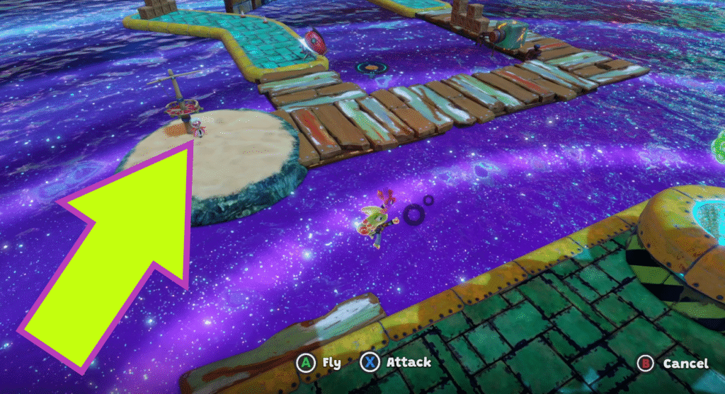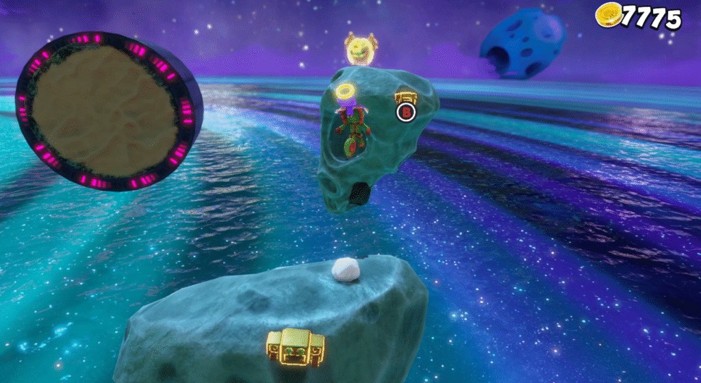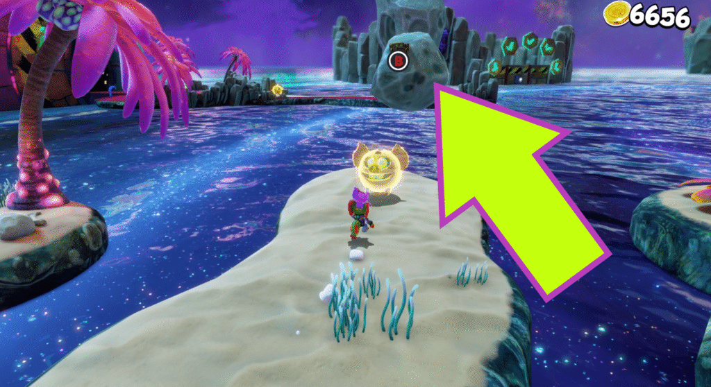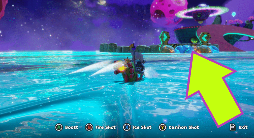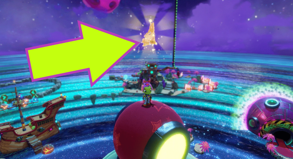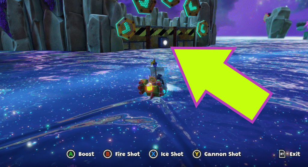 Return to the pirate ship in the middle of Galleon Galaxy, and this time head off the front of it, across more floating rocks to another island with a Mark fast travel point on it. Hit the steering wheel to raise a Bomb Plant you can use to blow up the molten rock blocking the door.