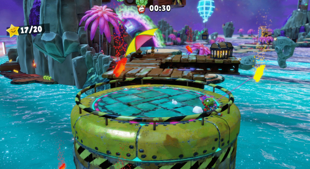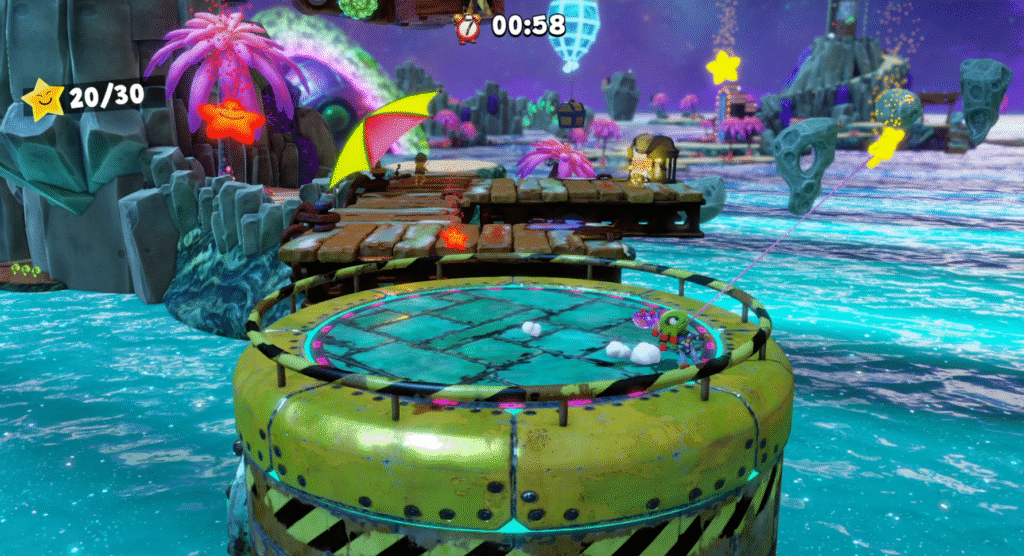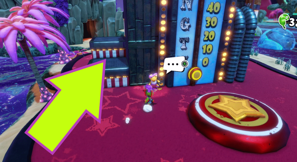 Get on the circular platform past them to start the minigame. You need to use Yooka’s tongue to collect Yellow Stars and avoid Red Stars. Once you have collected 20, you will finish the minigame and earn a Pagie.