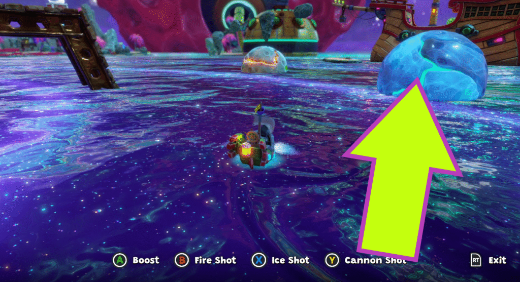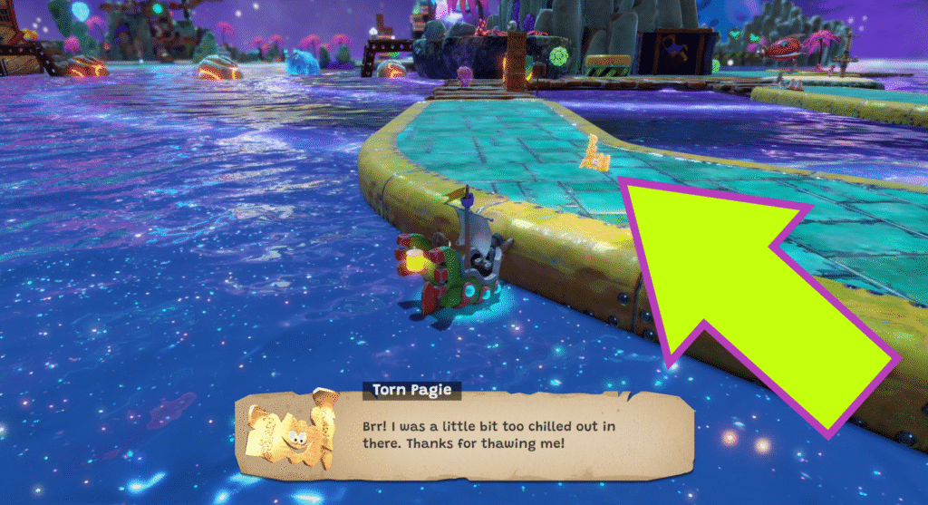 Use the D.N.Ray machine to turn yourself into a ship again and sail over to the large gate with a snowflake button on it. Shoot the button with your ice shot to lower the gate so you can sail freely. Turn to the right and melt the block of ice near where the gate was to free a torn Pagie.
