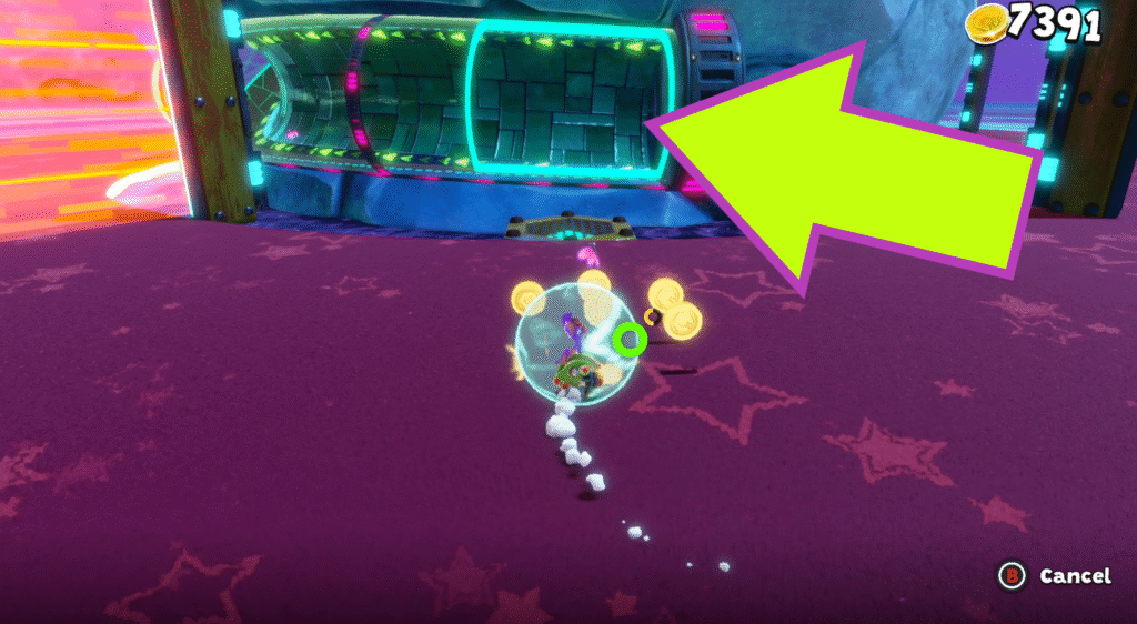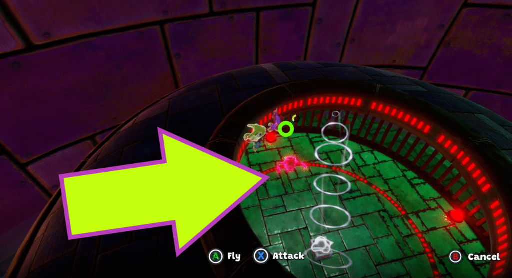 Past the last Pagie is another rotating cylinder with a red Q.U.I.D.D.S challenge ring above it. Jump through the hoop and collect the eight red Q.U.I.D.D.S coins before they disappear for another Pagie to appear at the other end of the cylinder.