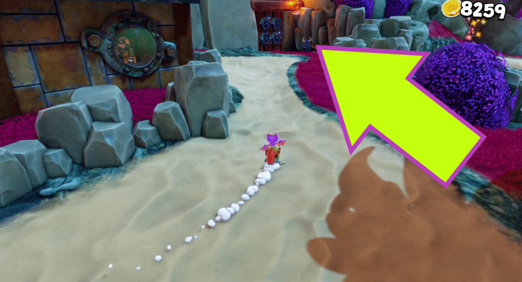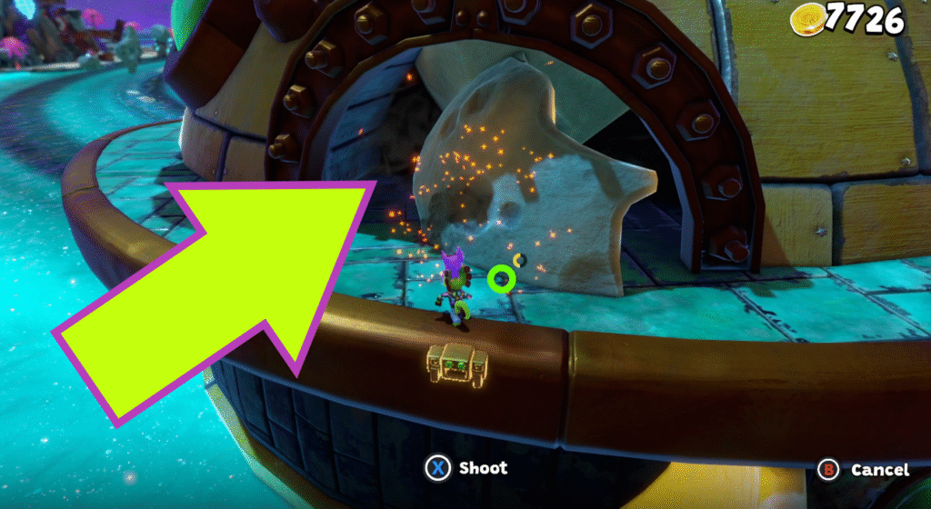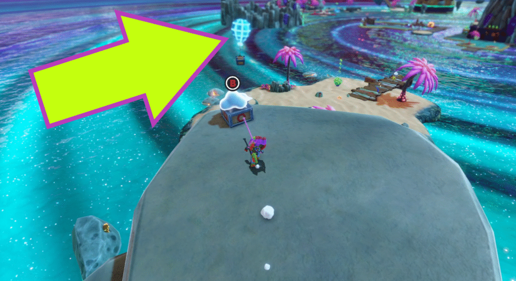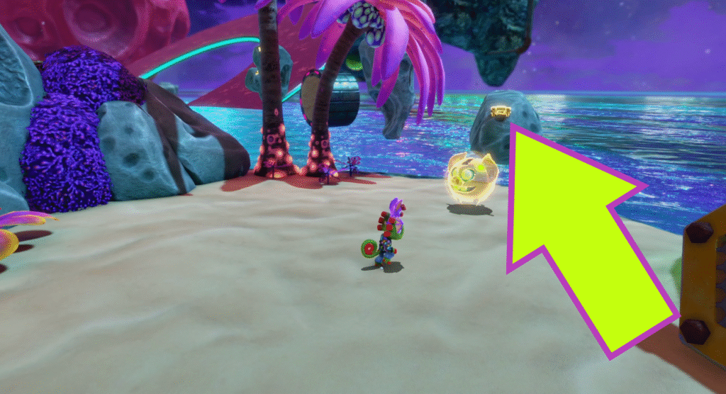Return to the platform with Dr. Puzz’s D.N.Ray device and use the vapor in the chest near where the barrier is to fly across to the island to the Northwest (it looks like a skull and crossbones on the map). Pop the balloon floating above the island using Laylee’s Sonar Shot. The chest will fall and smash to reveal the Play Coin you need to play Rextro’s arcade game.