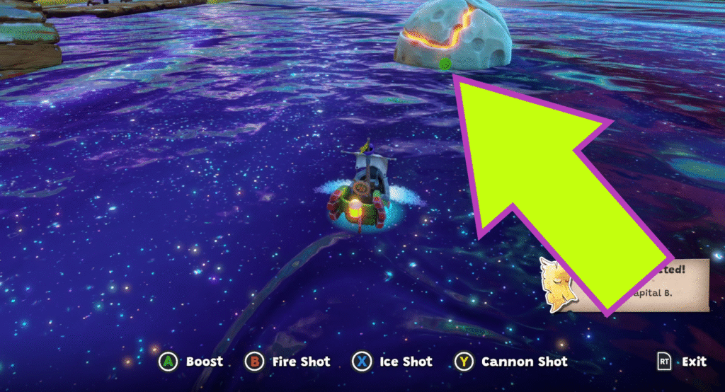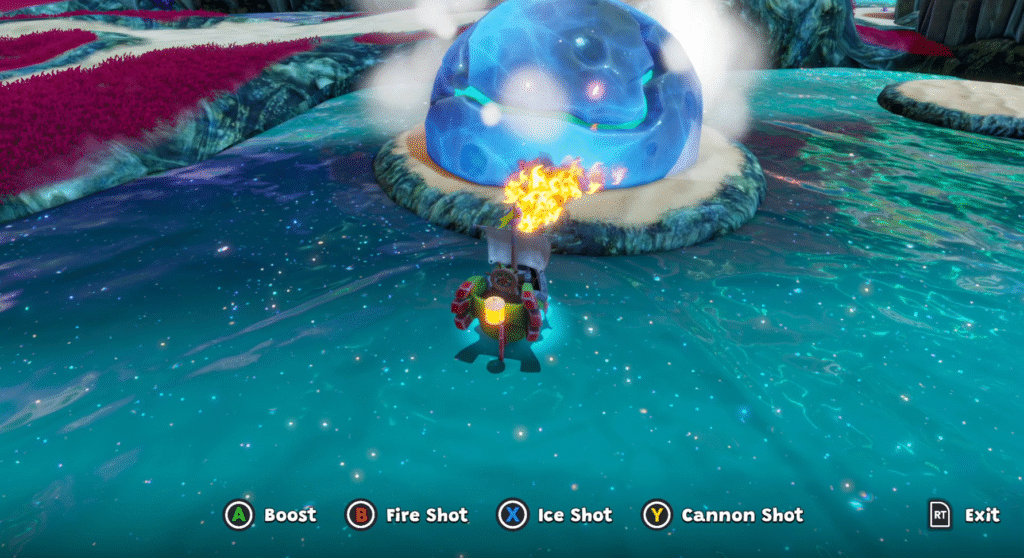 Exit this place and find a D.N.Ray machine to turn yourself into a ship again. Look to the left of the collapsed planet ring to see a rocky arena blocked by ice and molten rocks. Clear the rocks to find a small meteorite that asks for your help. Unfortunately, things don’t go well, and now you’ll have to face the boss of Galleon Galaxy, Planette.