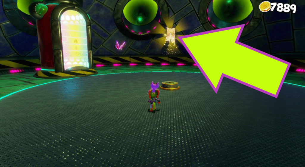 Grab the heavy metal state from the crate and climb back up the large podium and stand on top of the glass box with the Pagie inside. Do a Buddy Slam off the top to hit the button below, shattering the glass and releasing the Pagie.