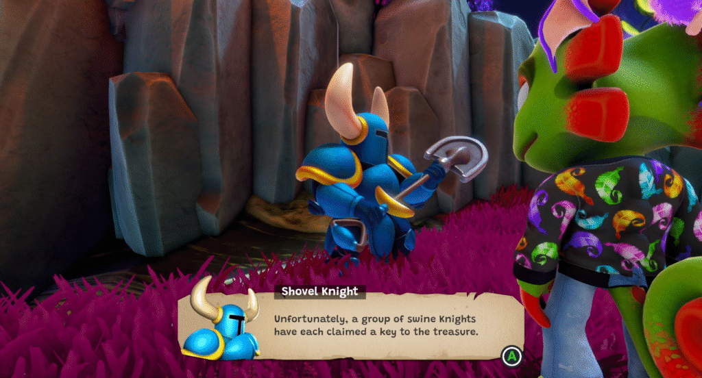 Head to the back of the larger island to find Shovel Knight standing in front of a door with four locks on it. He needs your assistance to retrieve four keys from the Knights of Hamalot.