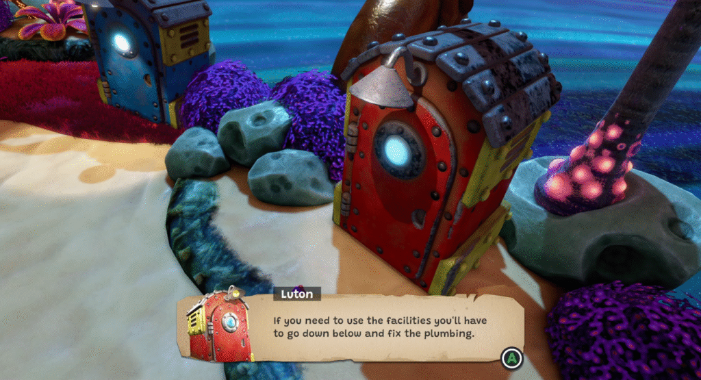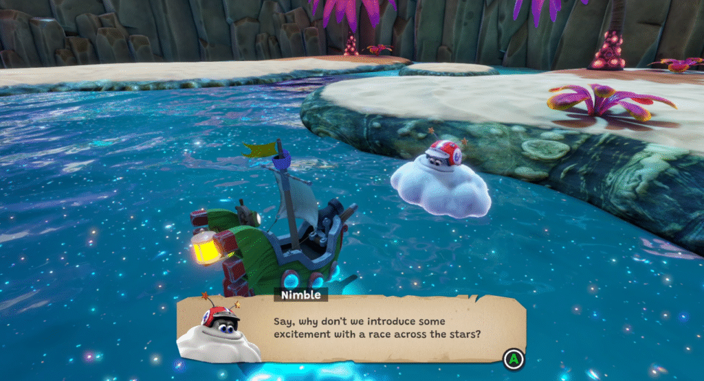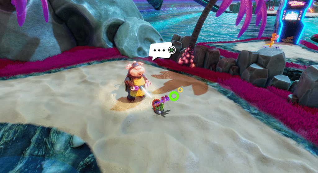 Head to the back of the ship and jump across the floating rocks to the island with a large robot on it. Jump up to the wooden platform on the left with the two Pagies in Cagies and speak with the Blamphibian about their minigame.