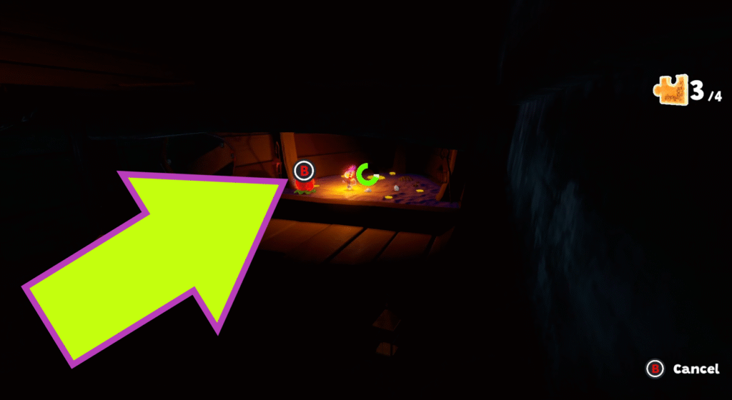 Next to where you found the chest with the Pagie Piece is a Fire Plant you need to grab. Head back up to the captain’s quarters and use your fire state on the lantern to light up the room. The captain will give you a Pagie.