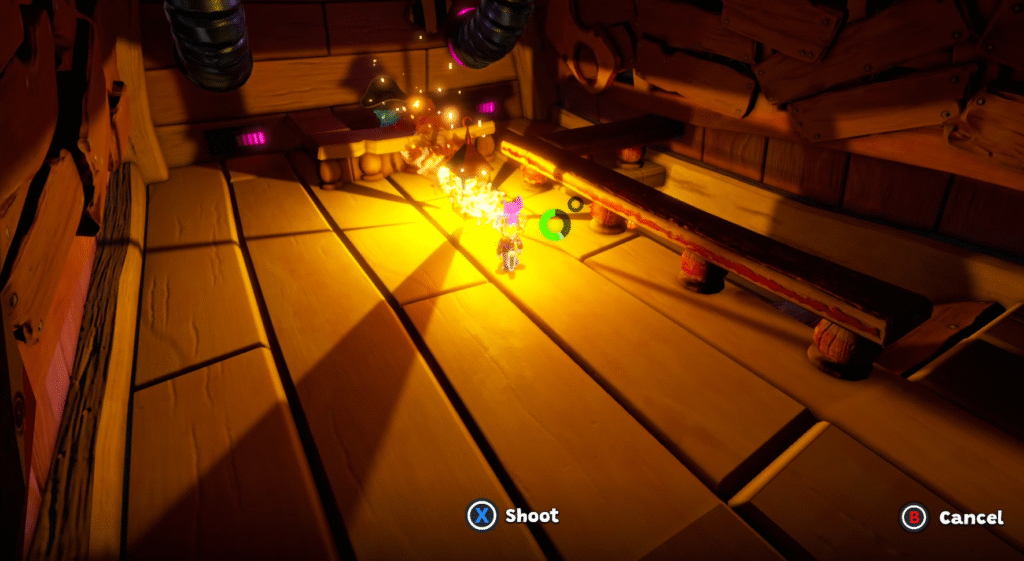Jump up and go inside the robot’s mouth. In this room, there is a Fire Plant hidden by some wooden crates. Use the fire state to light the brazier, and then buddy slam the button to create an air vent. This blows the fire towards the ice block, melting it and freeing a Pagie.