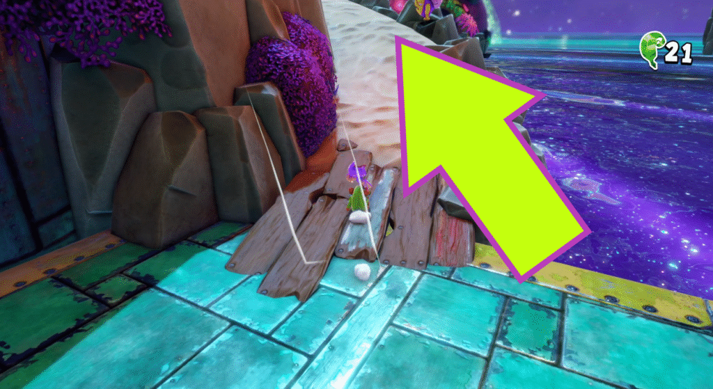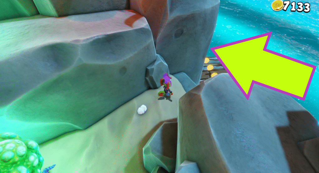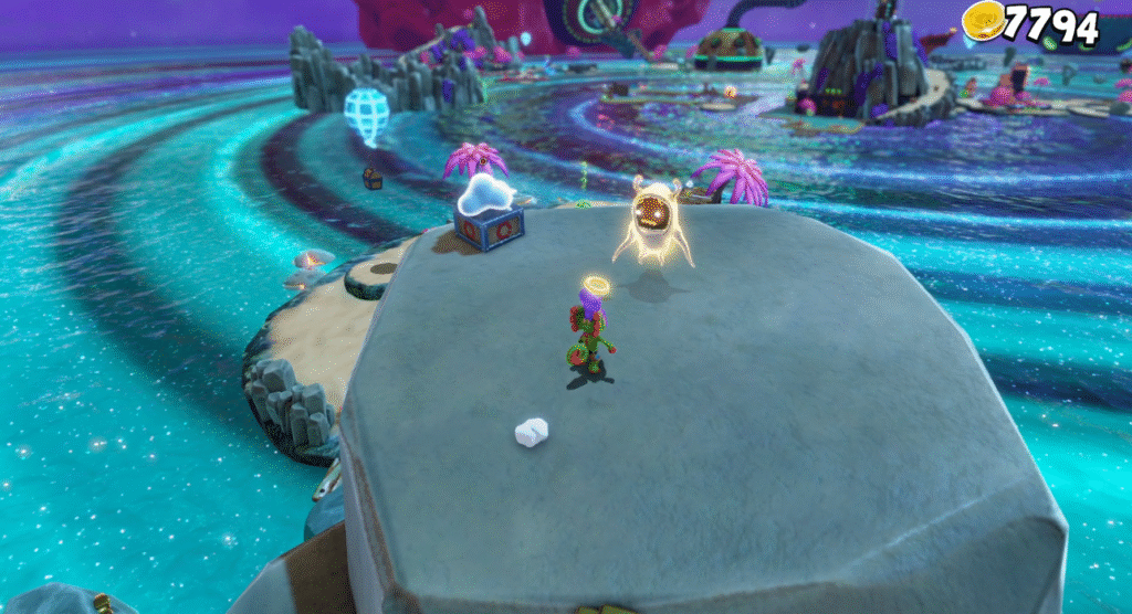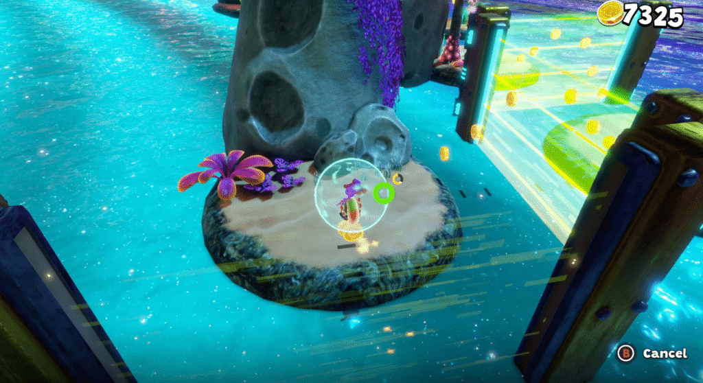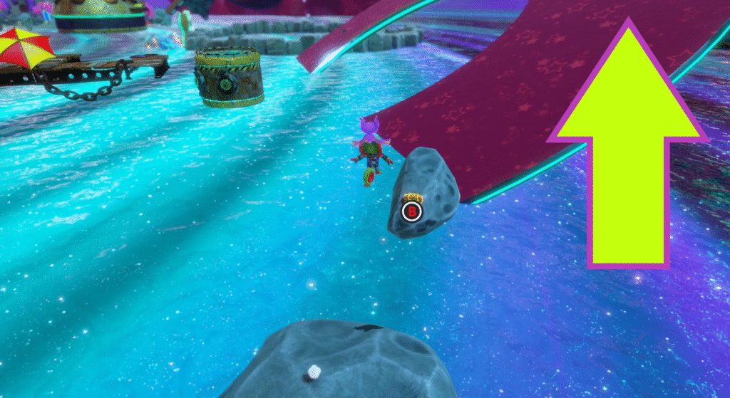 In the middle of all the little islets nearby is a red Q.U.I.D.D.S challenge hoop to jump through, starting a challenge to collect eight red Q.U.I.D.D.S coins spread across the islets. Collect them all before they vanish to earn a Pagie.