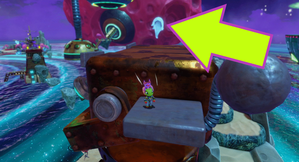 Grab the vapor again to get airborne and look for a large UFO structure you can flap over to and drop inside to find a Ghost Writer. Dodge their attack to stun them, smack them to capture them, and another Pagie is yours.