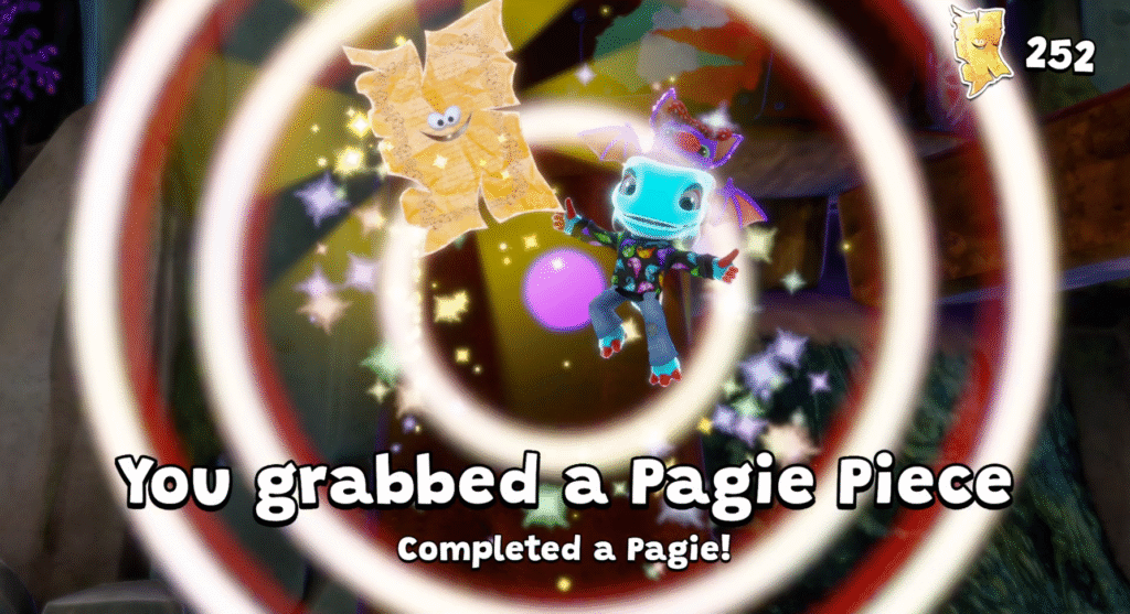 At the start of the level, turn around to look behind you and go up the floating pathway of tongue hookshot points. At the top of this little platforming section, you’ll find a Ghost Writer who will give you the first Pagie for capturing them.