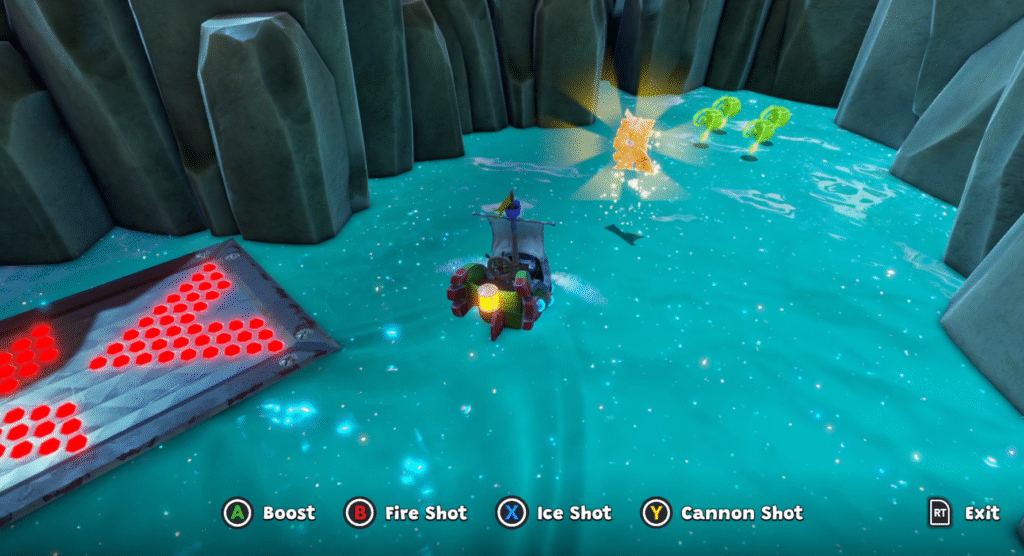 Shoot the button with your ice shot to lower the barrier and reveal a blue challenge hoop waiting for you. Sail through it to start a timed challenge where you must sail through the island, shooting cutouts, using speed boost panels, and avoiding brake panels. If you destroy all of the cutouts before the time runs out, a Pagie appears at the end of the course.