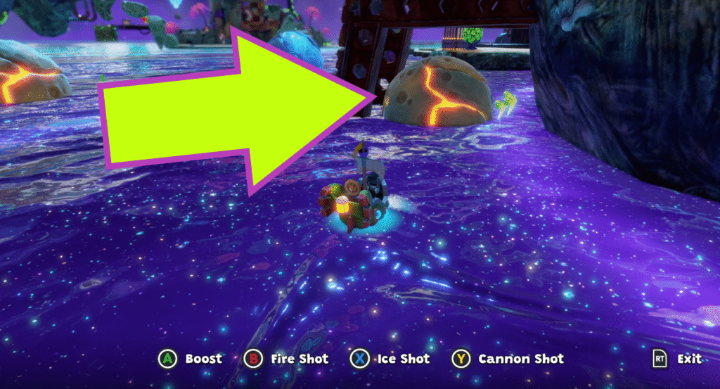 Sail back to the central island with the tower on top and go to its backside, which faces a pirate ship. There is a wooden jetty sticking out with a molten rock underneath it. Shoot the rock to destroy it and find another