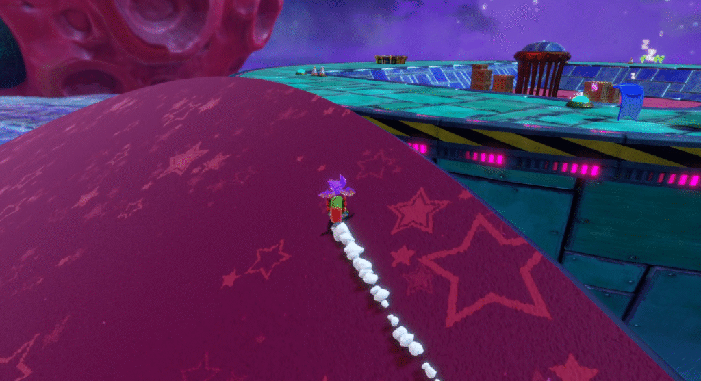 Leave this chamber and roll up the ramp to another floating island, where three large spiky ball minions will surprise attack you. Knock all three of them off using Laylee’s Sonar Shot or the Bomb Plant hidden behind some trees, and the last Pagie Piece will appear. Collecting it completes another Pagie.