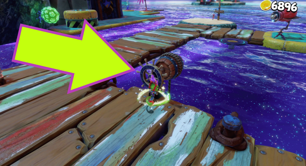 Back outside, there is a Pagie at the very top of the pirate ship’s mast. You can do some fiddly platforming to get up there, or fly using some vapor from one of the many chests in the level for an easier time.