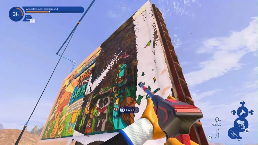 On the ground, you’ll see a small rectangular blue tool. As with the other tools, like the ladders, it’ll automatically highlight specific locations that the tool can be used on. In this case, you can place it at the front of this billboard. You can also pick it up again and relocate it to the billboard’s backside.