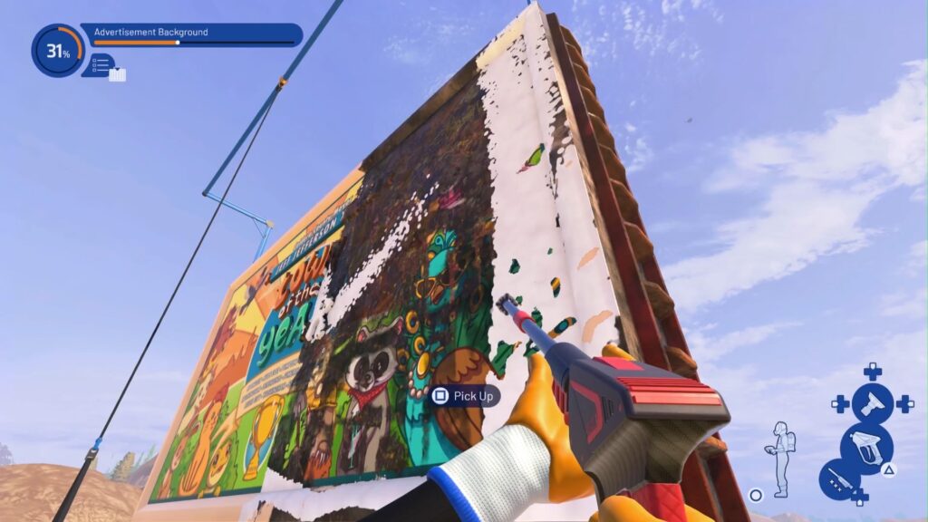 On the ground, you’ll see a small rectangular blue tool. As with the other tools, like the ladders, it’ll automatically highlight specific locations that the tool can be used on. In this case, you can place it at the front of this billboard. You can also pick it up again and relocate it to the billboard’s backside.