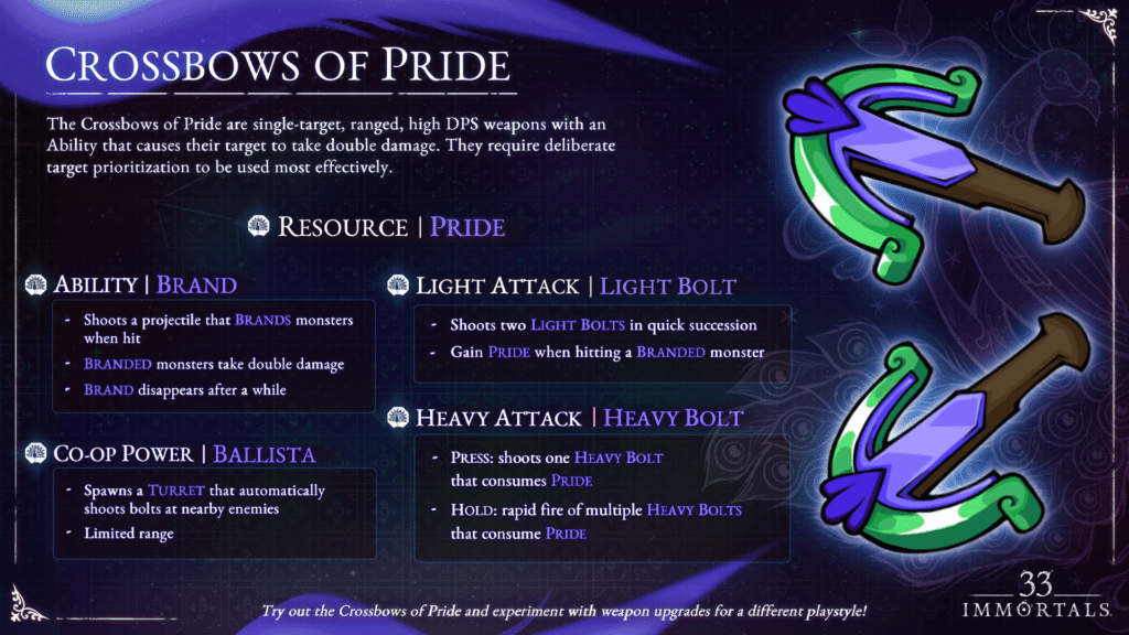 The Crossbows of Pride are a new ranged weapon for Damned Souls to enjoy, and the dev team has gone to great lengths to make sure it feels distinct from the Bow of Hope. Players who enjoy focusing down a single target will want to try out these dual crossbows, as they are all about Branding a target to deliver damage at a speed not yet seen in 33 Immortals! This is achieved by holding down the heavy attack to enter a rapid fire state that uses up Pride, which you get back from hitting Branded enemies.