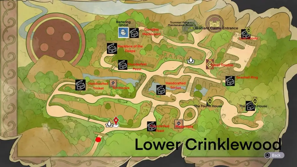 You start Lower Crinklewood at the bottom of this map, introducing game mechanics like the rest spot, where you can talk to your friends as well as replenish your health.