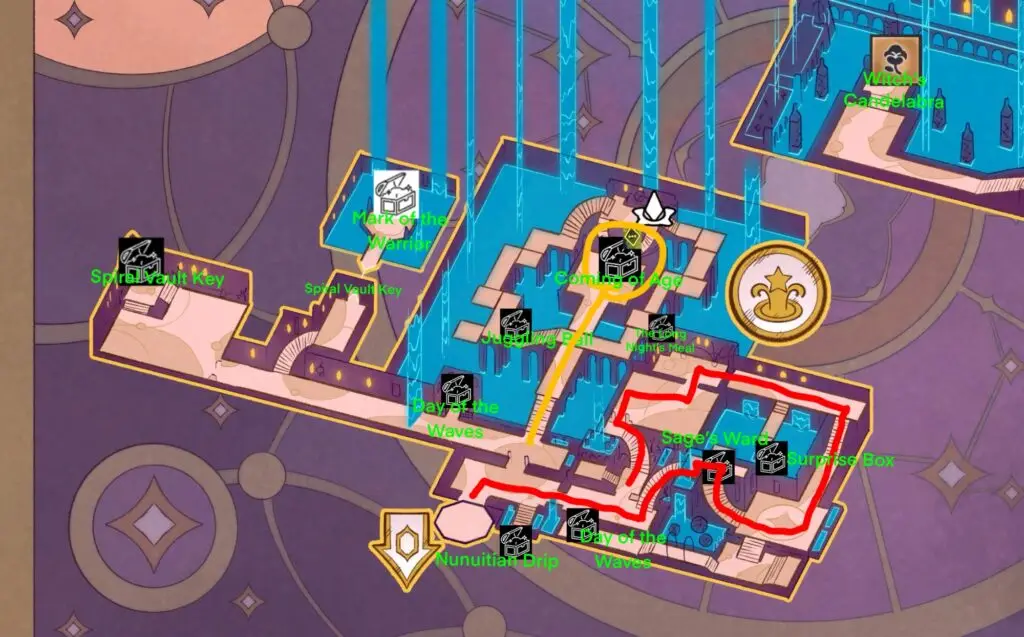 Also, go back to that barrier you opened, and to the left of it is a waterfall that initially looks like you can’t get through it. Getting that key will open up a treasure room with a golden chest and equipment called the Mark of the Warrior.