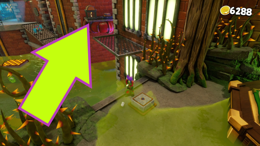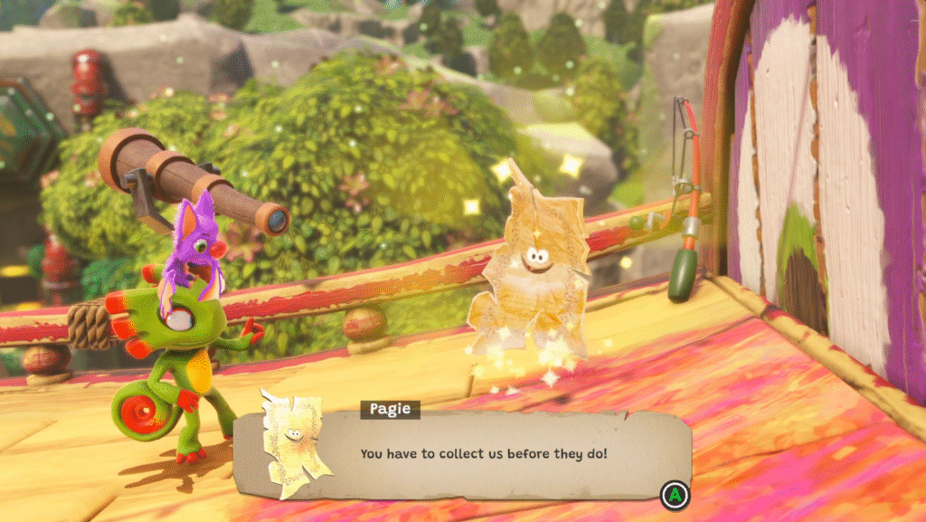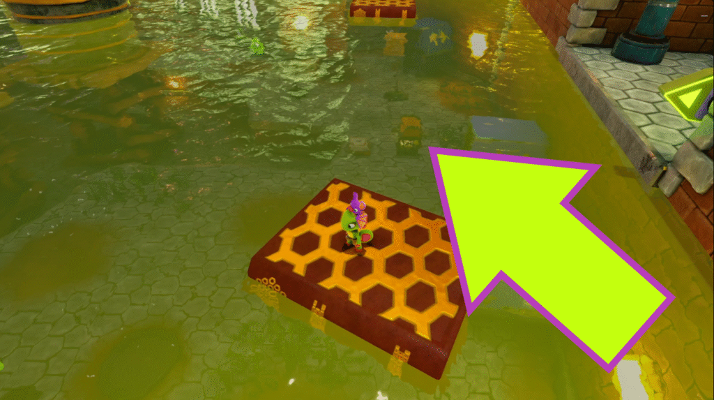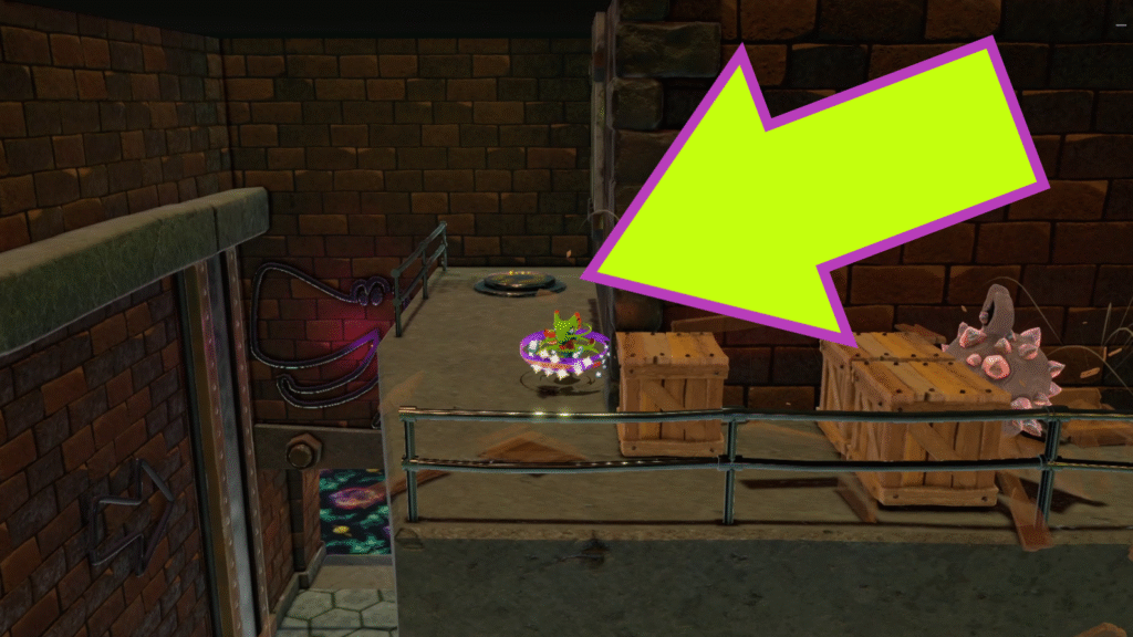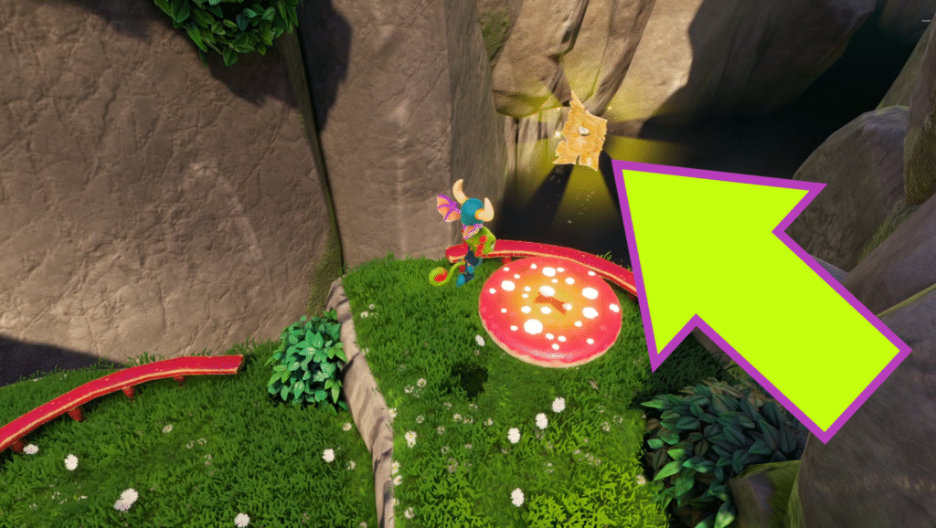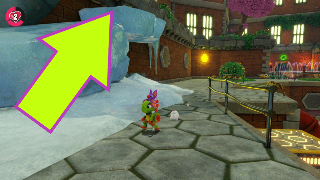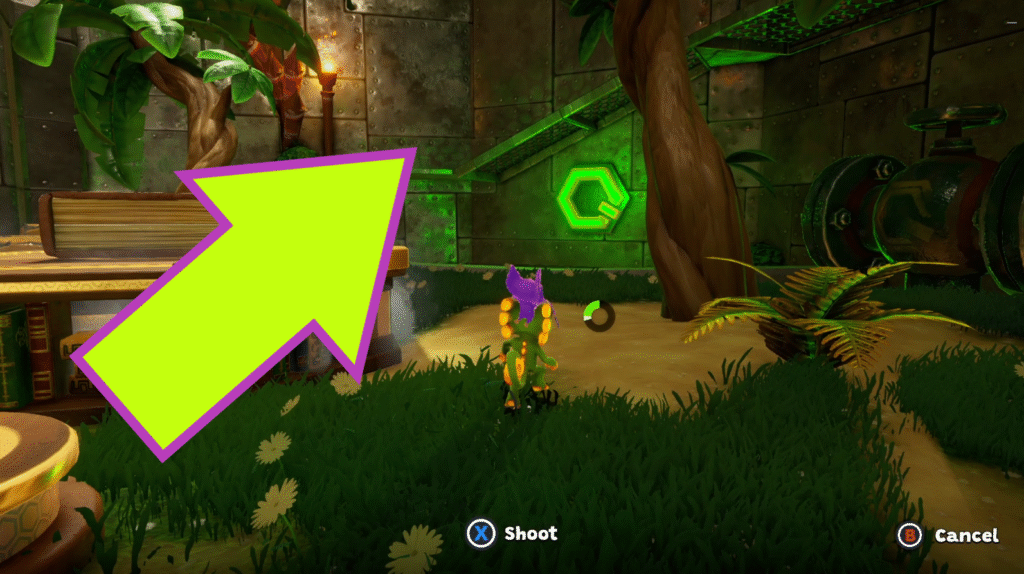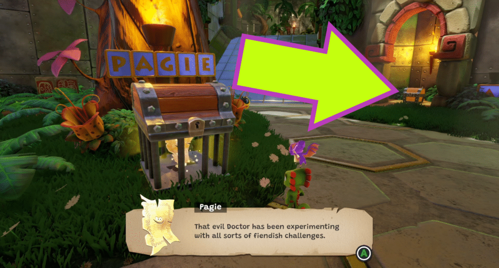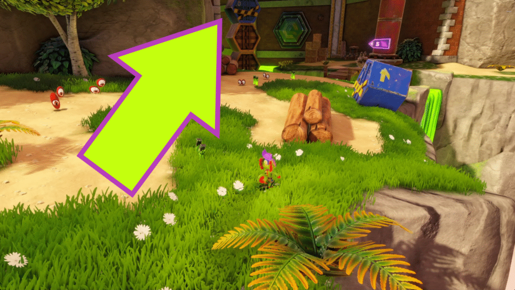 Back at ground level, near the back of Yooka and Laylee’s ship, is an enclosed area blocked by a block. Use Yooka’s tongue to pull the block out of the way, then spin attack the plant inside. Finally, Buddy Slam on the spot where the plant was to reveal a Pagie.