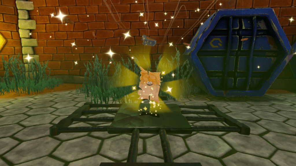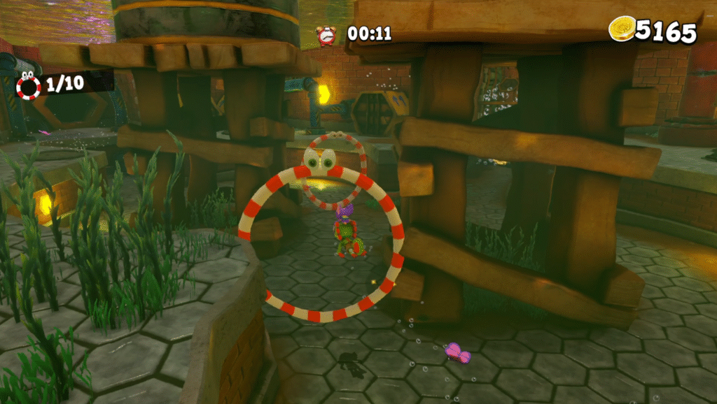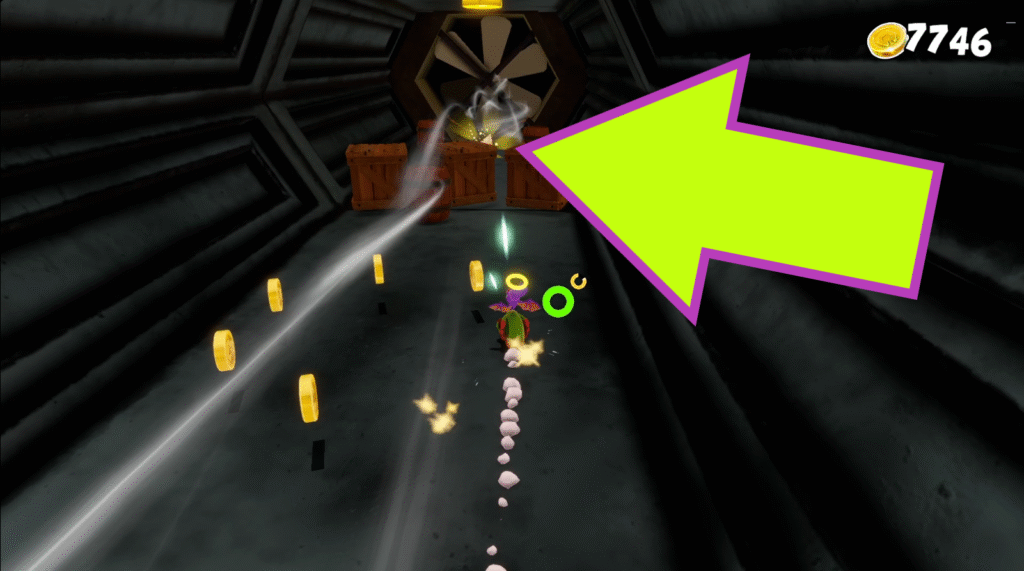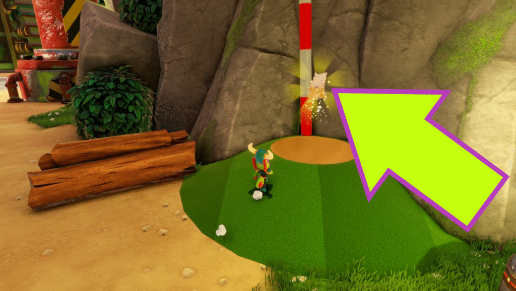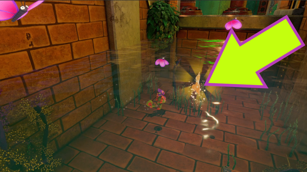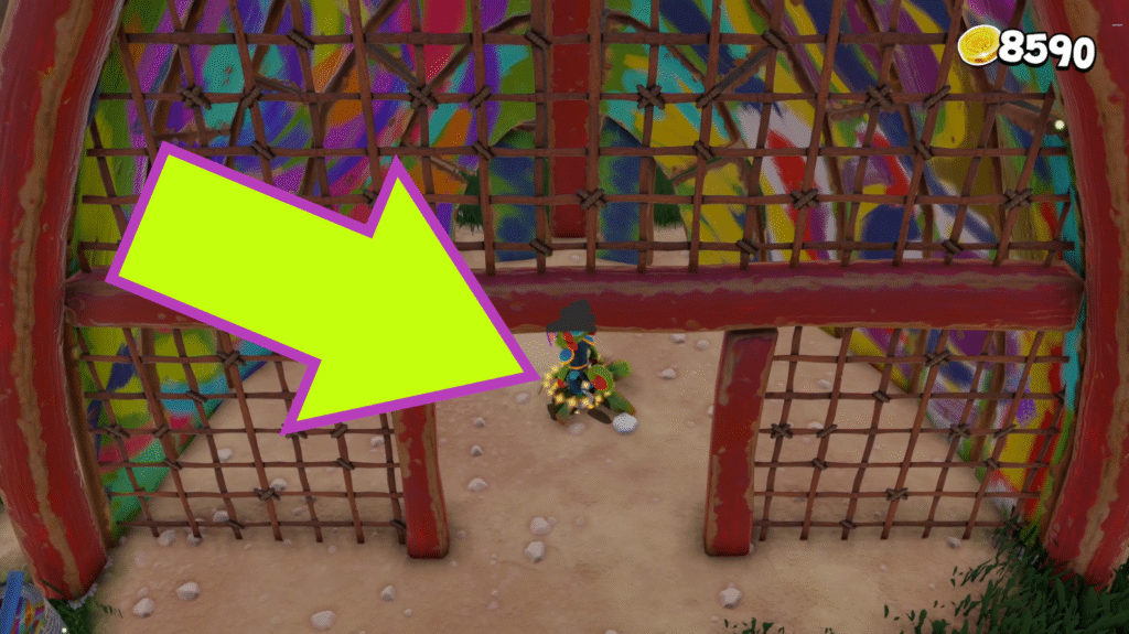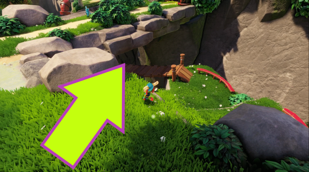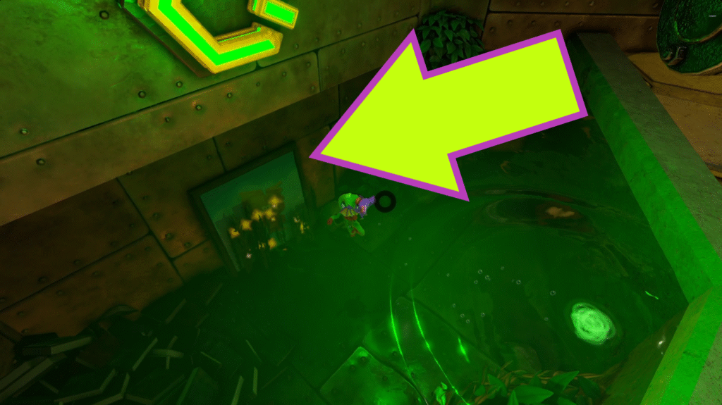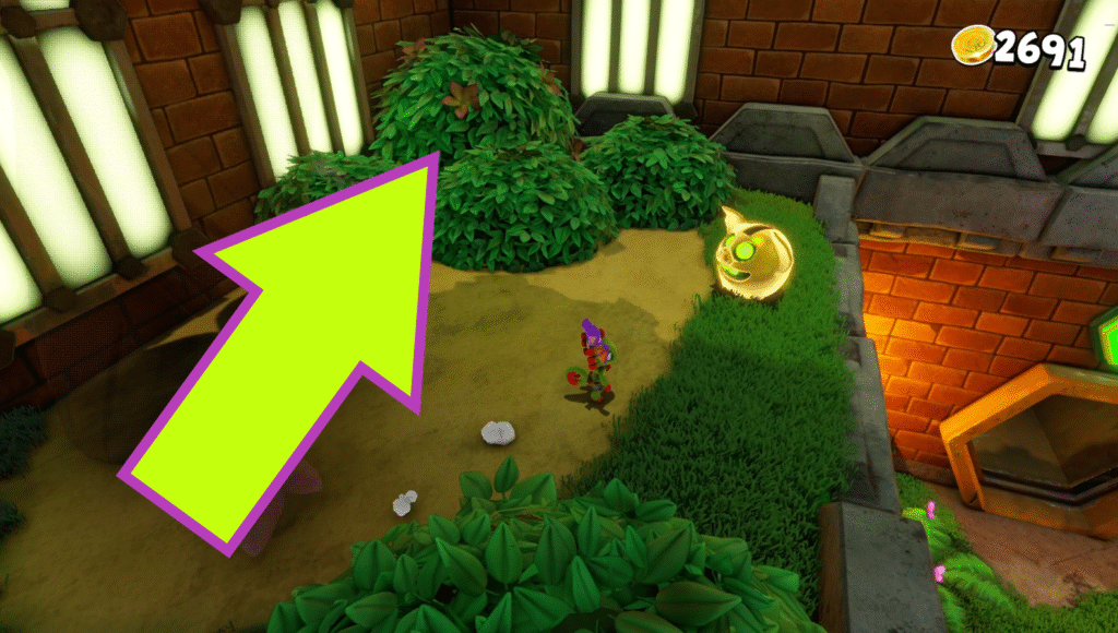 Back at ground level, near the back of Yooka and Laylee’s ship, is an enclosed area blocked by a block. Use Yooka’s tongue to pull the block out of the way, then spin attack the plant inside. Finally, Buddy Slam on the spot where the plant was to reveal a Pagie.