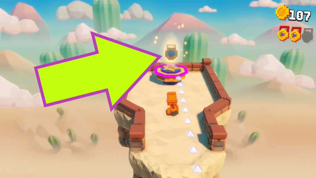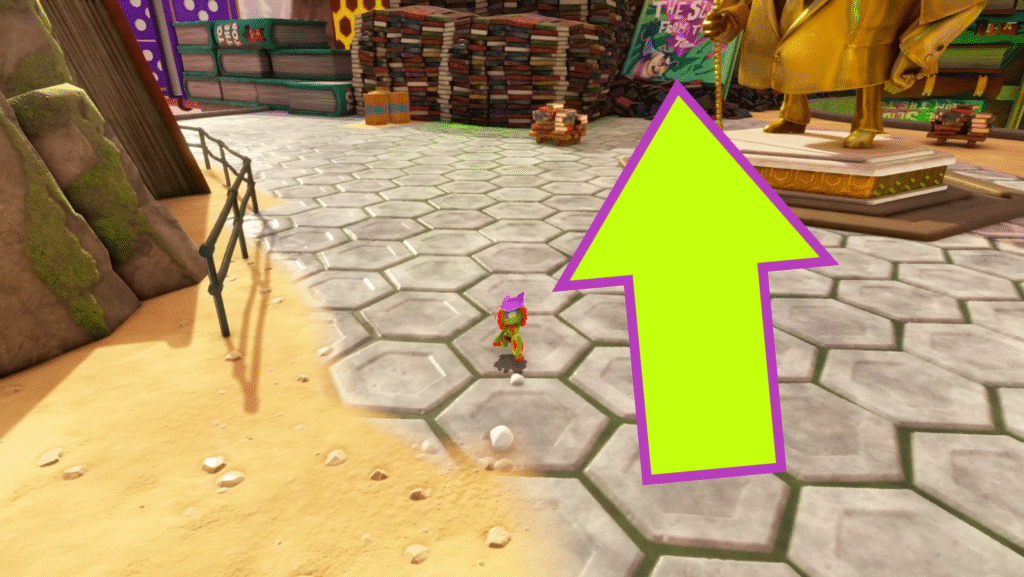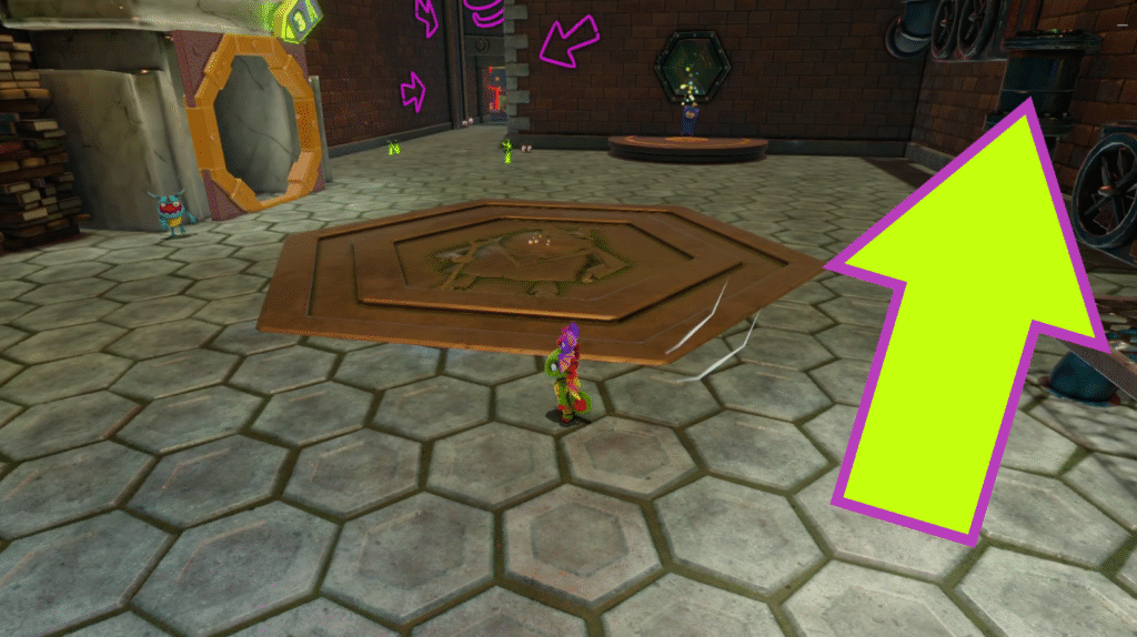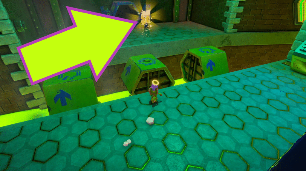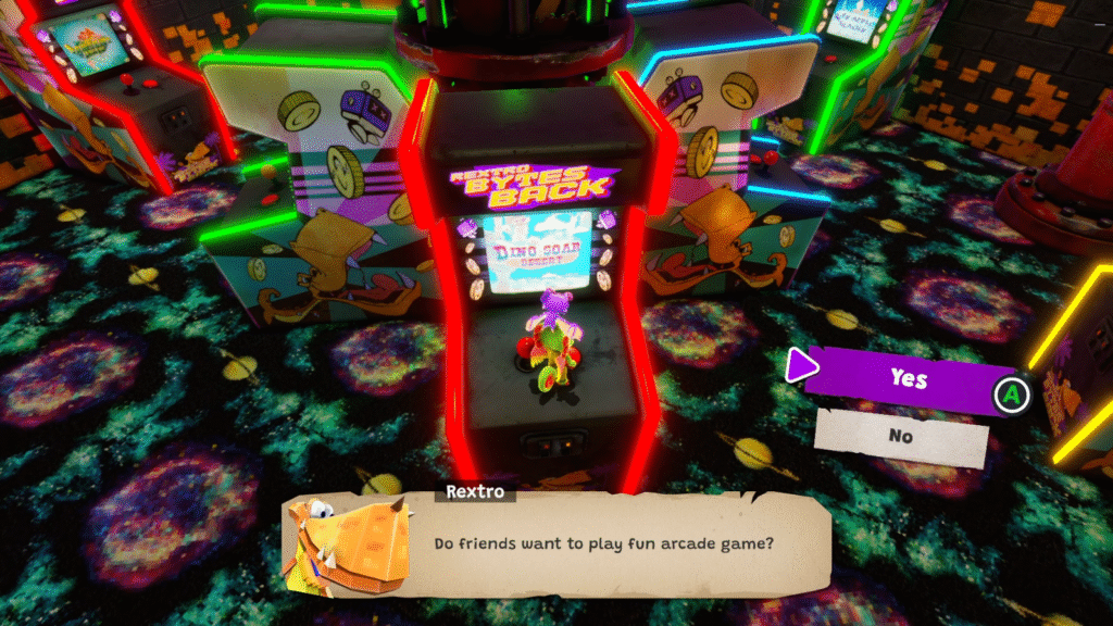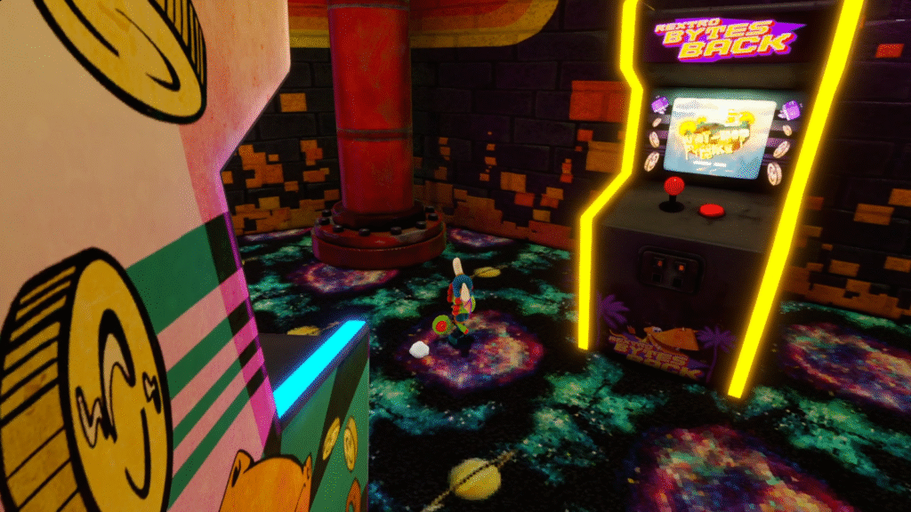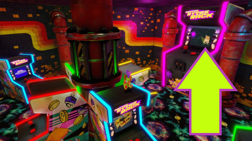Drop down into the passage and follow the neon arrows into Rextro’s arcade. There is an arcade machine with a cracked screen and a Pagie inside. Smash the screen and grab your prize.