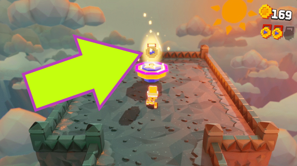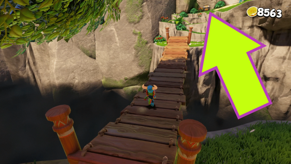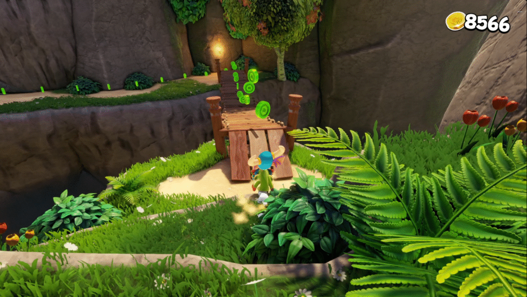 Head towards the door to enter Hivory Towers and take the wooden bridge path below. Jump up the natural steps at the end of the last bridge to find a chest containing a green Q.U.I.D.D.S coin. Grab this first coin to create a line of green Q.U.I.D.D.S coins you need to collect before they disappear. Success is rewarded with a Pagie.