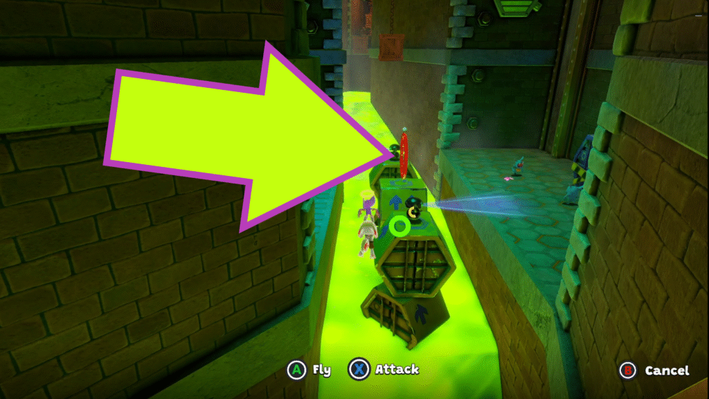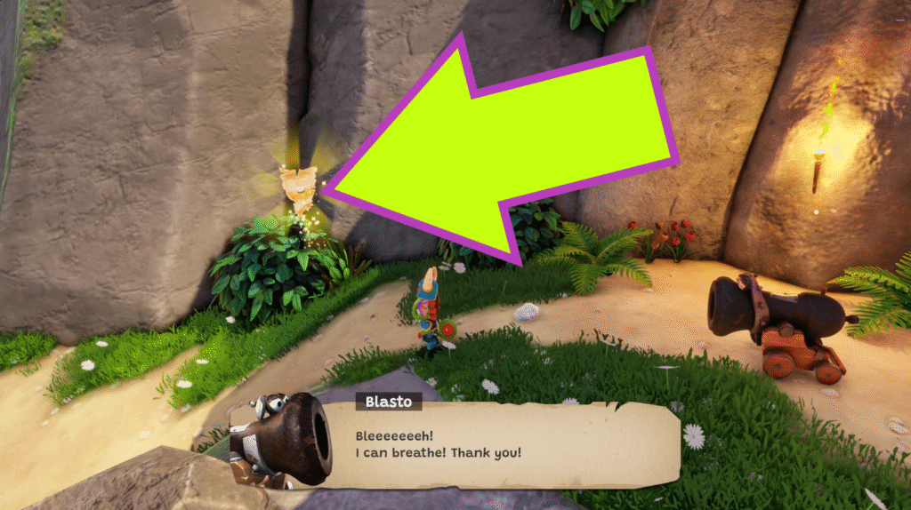 Drop down to the ground and look for a natural slope against the wall behind the ship that leads you to Blasto the cannon. Buddy Slam on his back and he’ll cough up a Pagie.