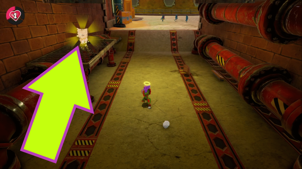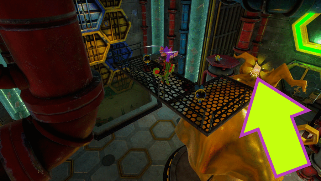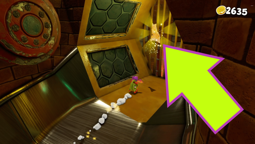 Head up the ramp to find a Pagie guarded by a security camera and two large spike ball enemies. Knock the minions off the ledge using Laylee’s Sonar Shot and then use Yooka’s Camouflage to get past the camera and grab the Pagie.
