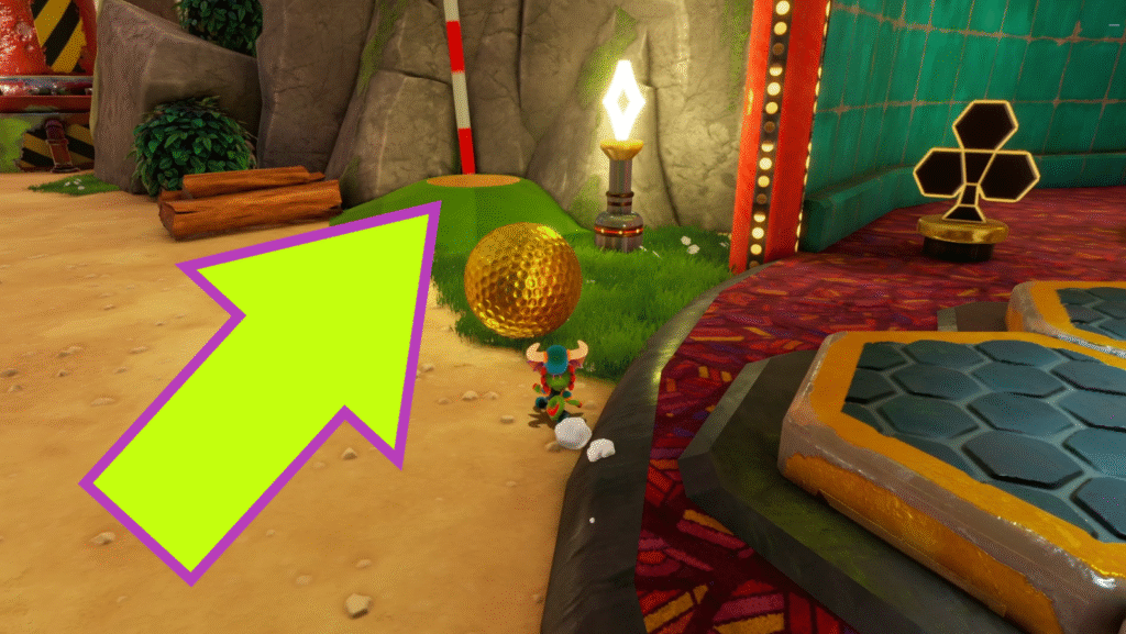 At the end of the ramps, head through the security door to find a large gold golf ball. Roll it down the ramp and guide it to the hole near the Capital Cashino grand tome to win a Pagie.