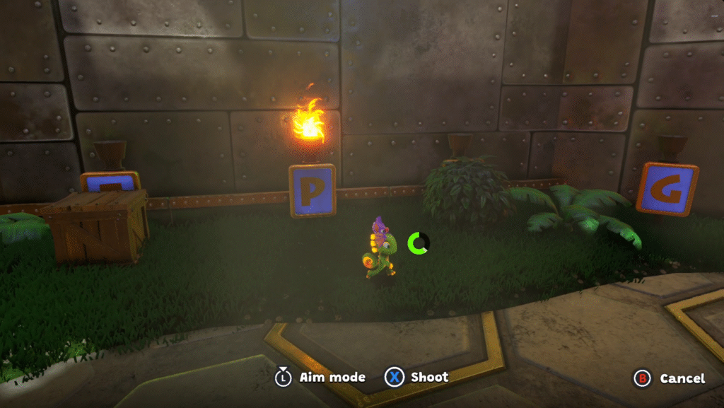 Roll up the ramp out of this room into a higher chamber with a Pagie in a Cagie. You need to light the lamps opposite the imprisoned Pagie in the right order to spell PAGIE using the Fire Plant next to them. Once this is done, the Pagie will be freed.