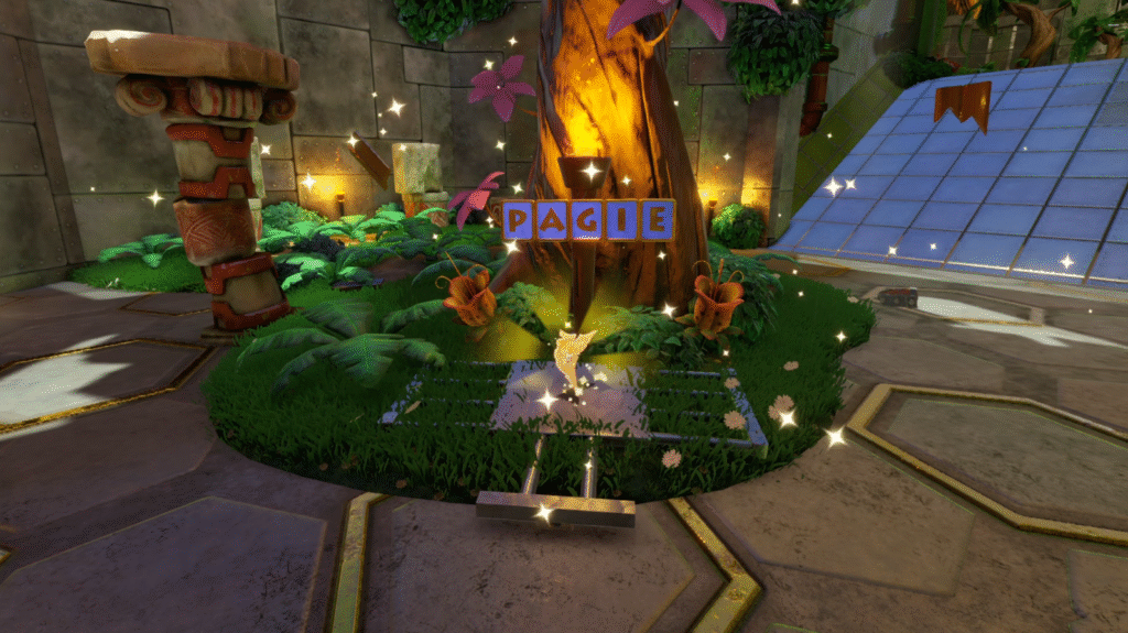 Roll up the wide ramp to where the grand tome for Tribalstack Tropics awaits, and jump into the pool of water next to it. Hit the glittering portrait of a Pagie to find another Pagie.